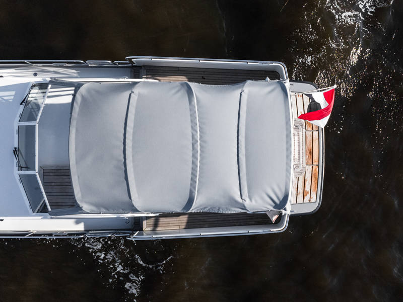 Aan dek is ruim zitplaats op de vaste bank met fijne kussens en het achterdek is rondom de bank geheel afsluitbaar met een extra grote cabriotent.