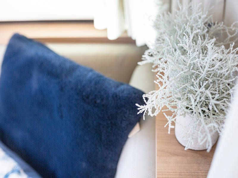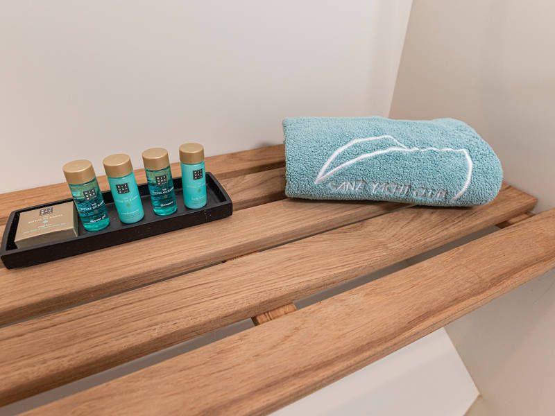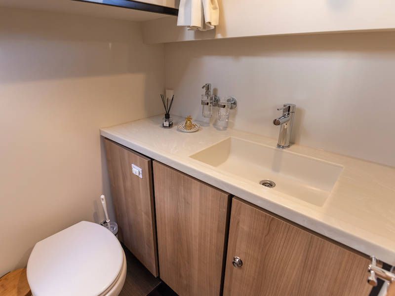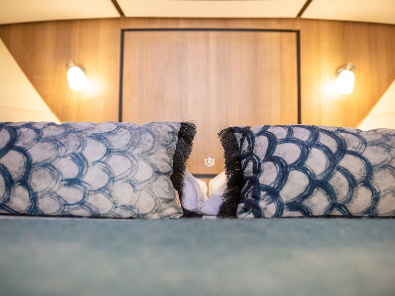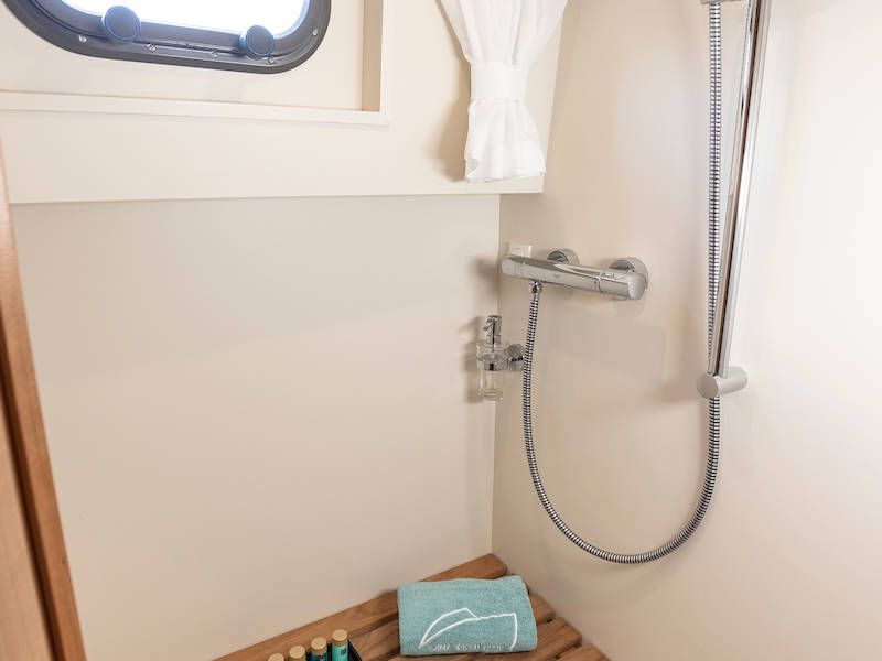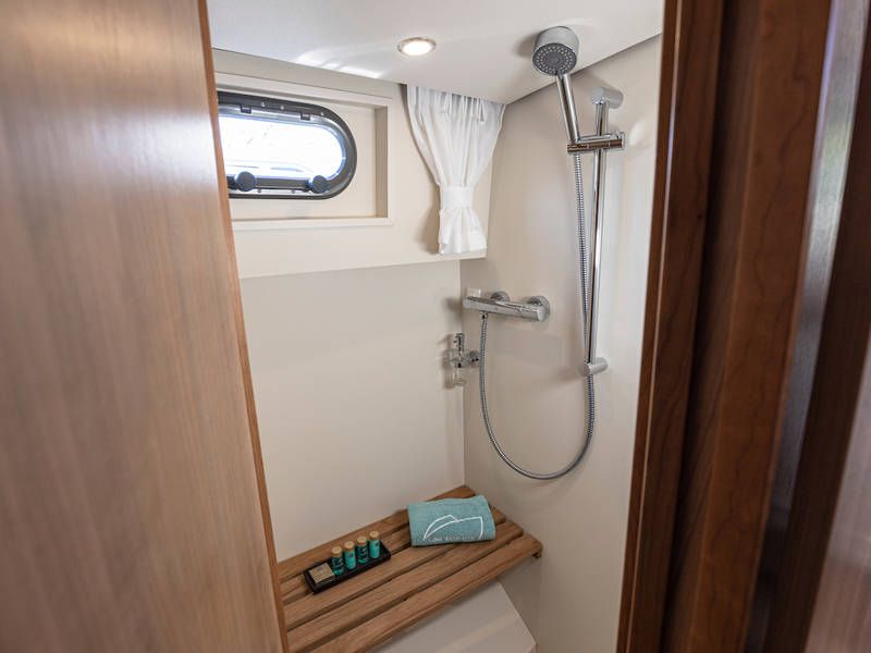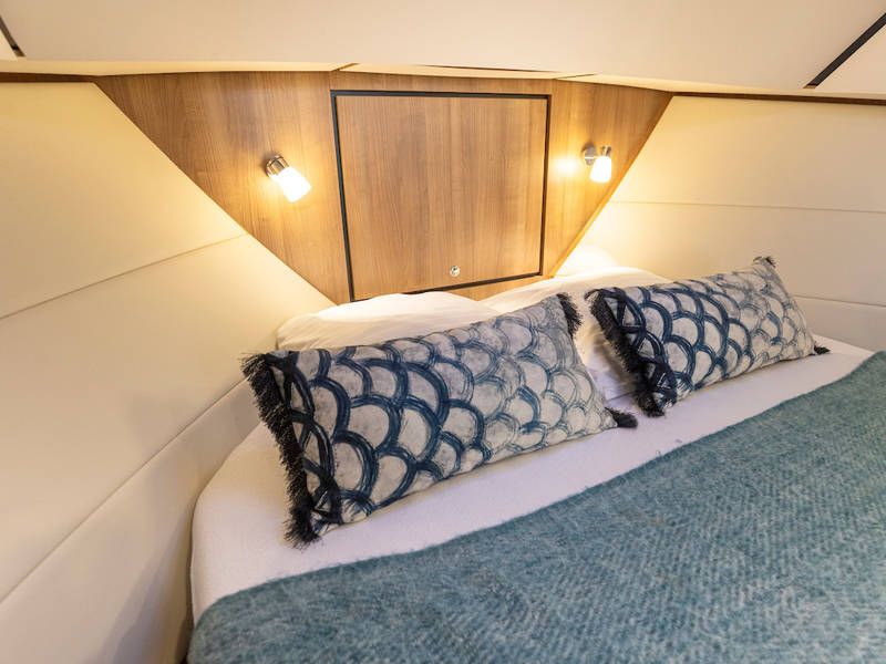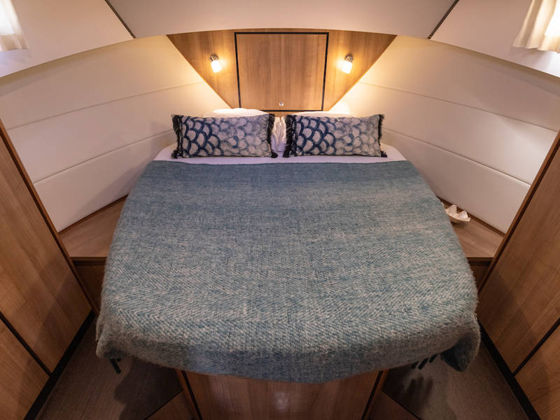 Op dit compacte jacht is verrassend veel ruimte! In de voorhut is een sfeervolle captains-cabin met een twee-persoonsbed, badkamer met elektrisch toilet en wastafel en een aparte natte cel met een douche.