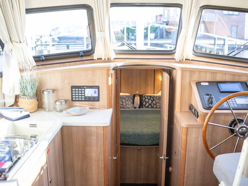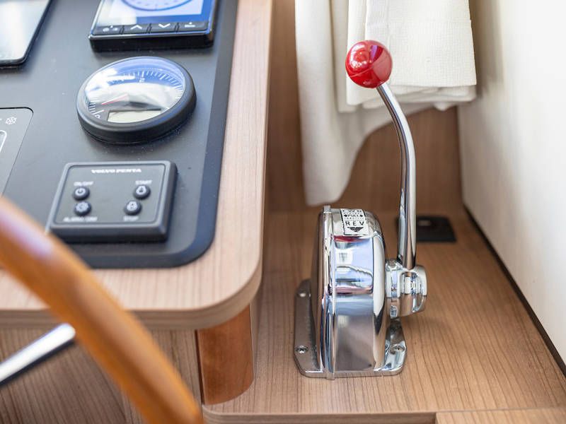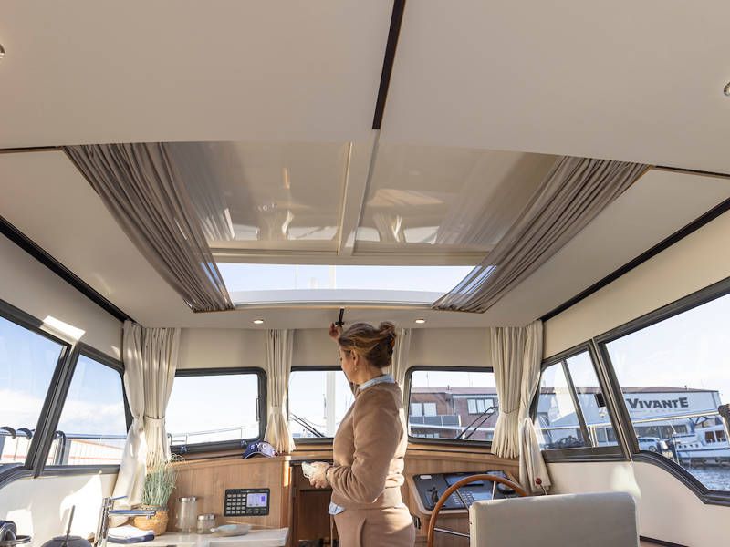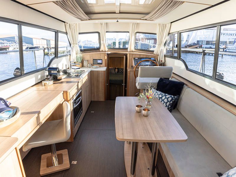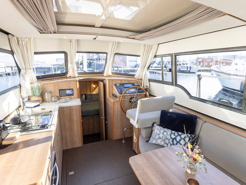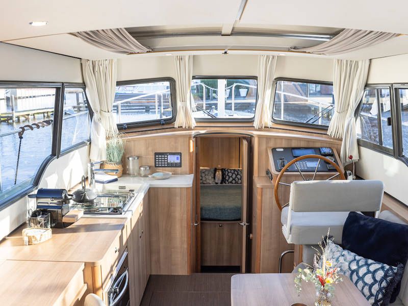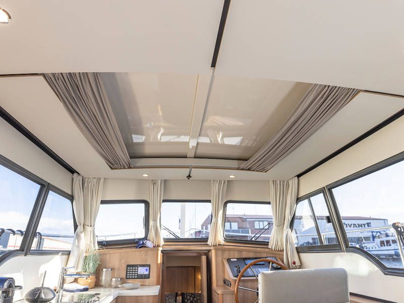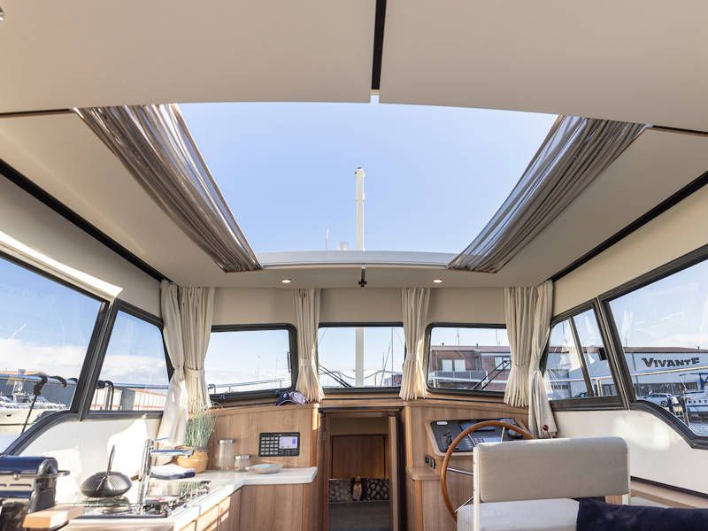 Aan stuurboordzijde is de stuurpositie en dashboard welke is uitgerust met een compleet navigatiepakket. Boven de keuken en de stuurstand is een scheepsbreed schuifluik, wat het ' buiten sturen gevoel' benadrukt.