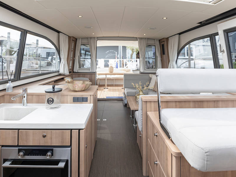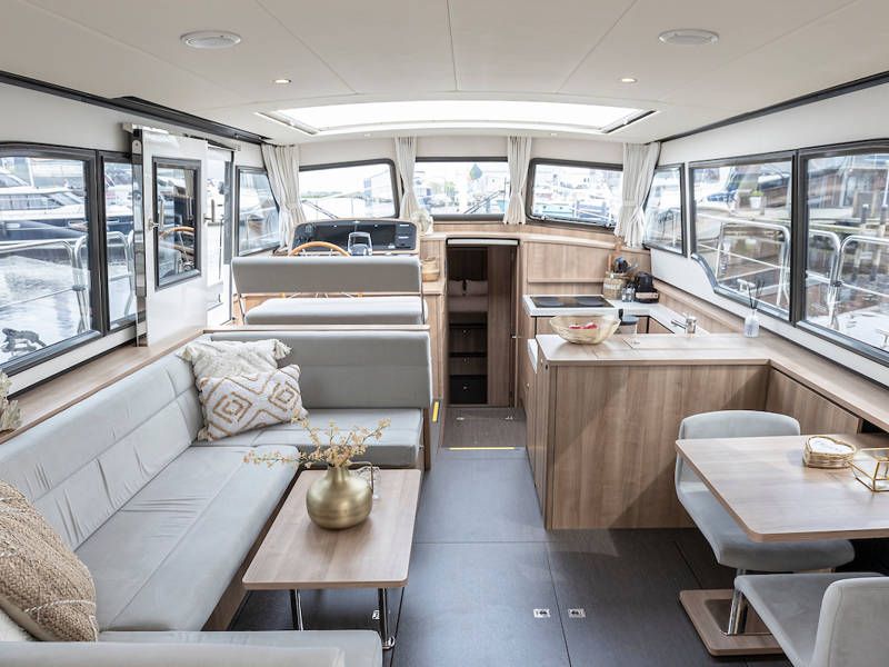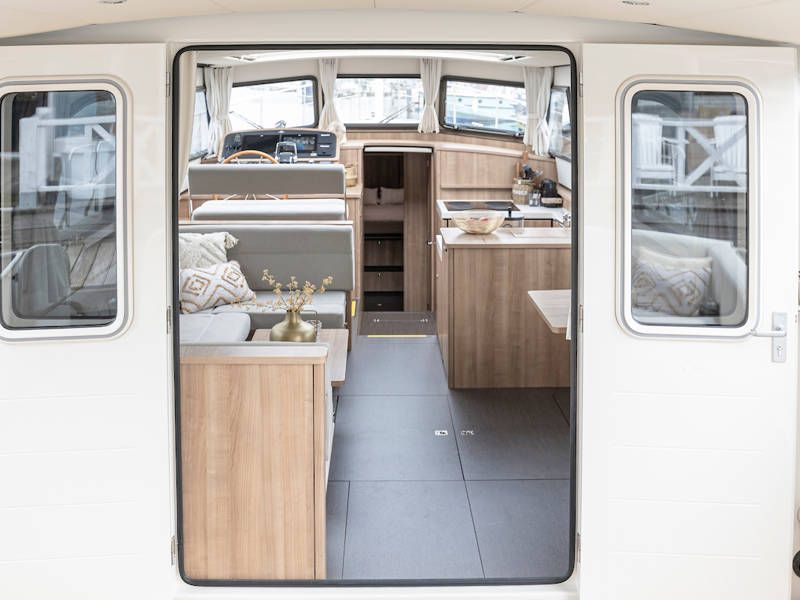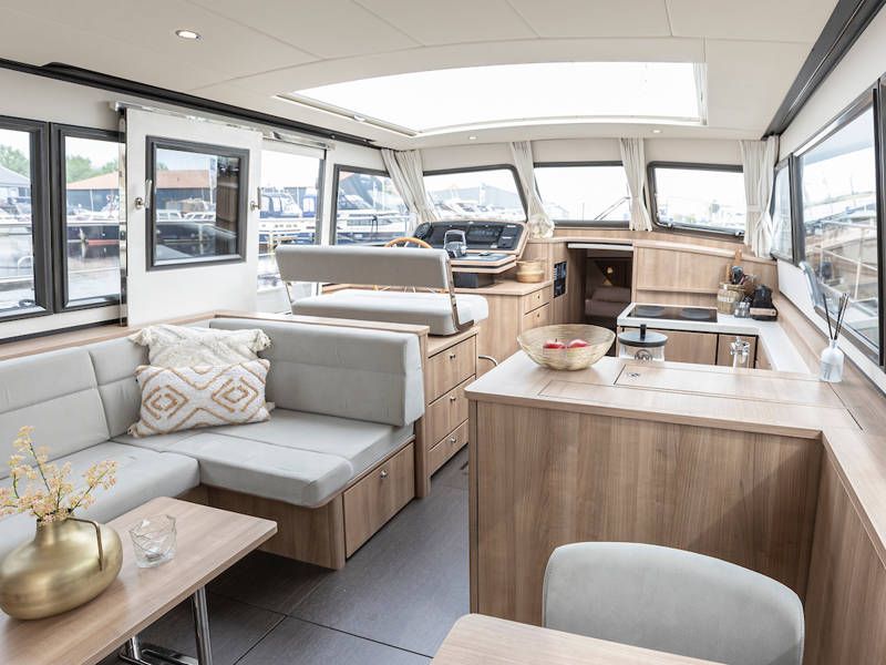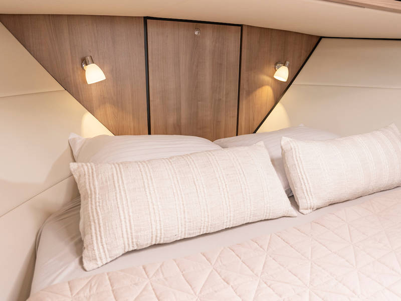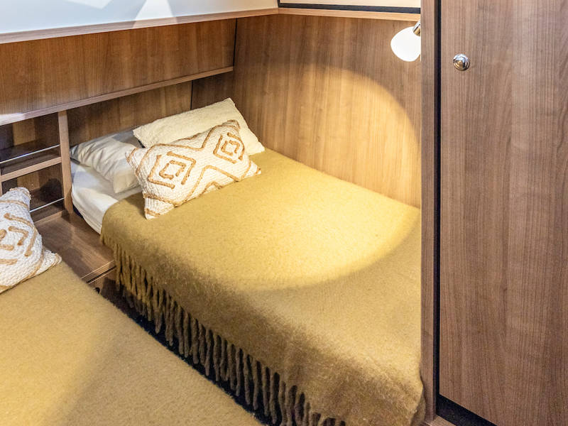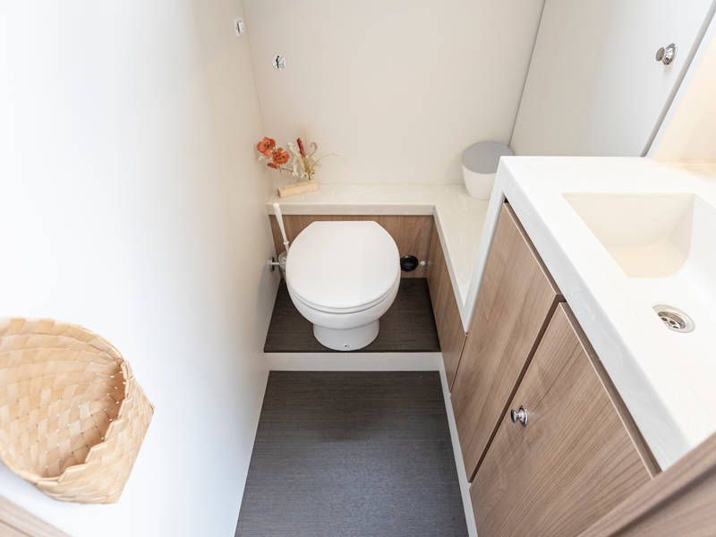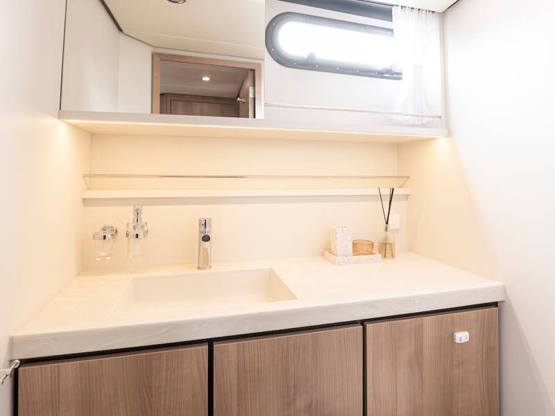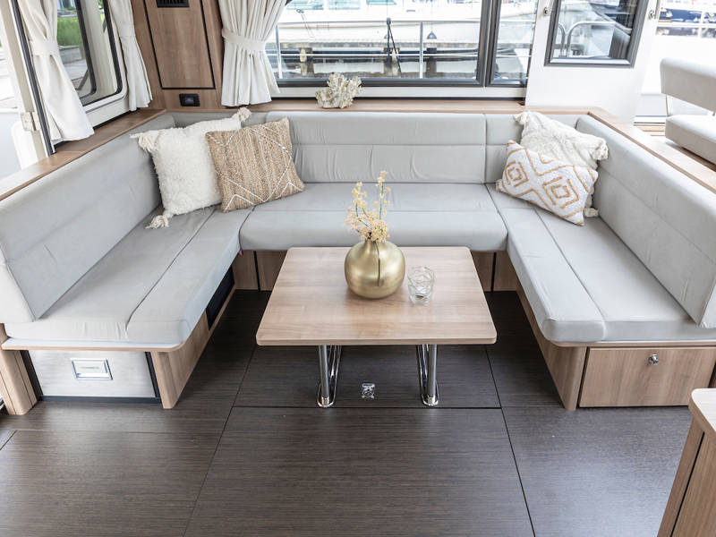 Het jacht is ingedeeld met 2 slaaphutten, twee badkamers, twee toiletten, uiteraard elektrisch en een ruime douche. In de salon is een easy-sleep-systeem, waar in een handomdraai een 2-persoonsbed van gemaakt kan worden.