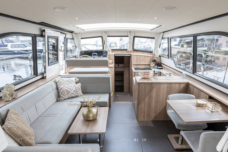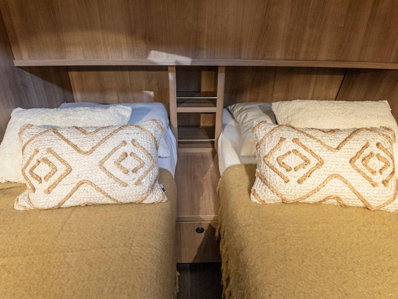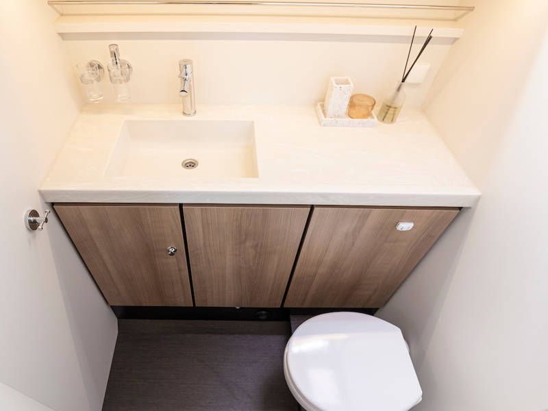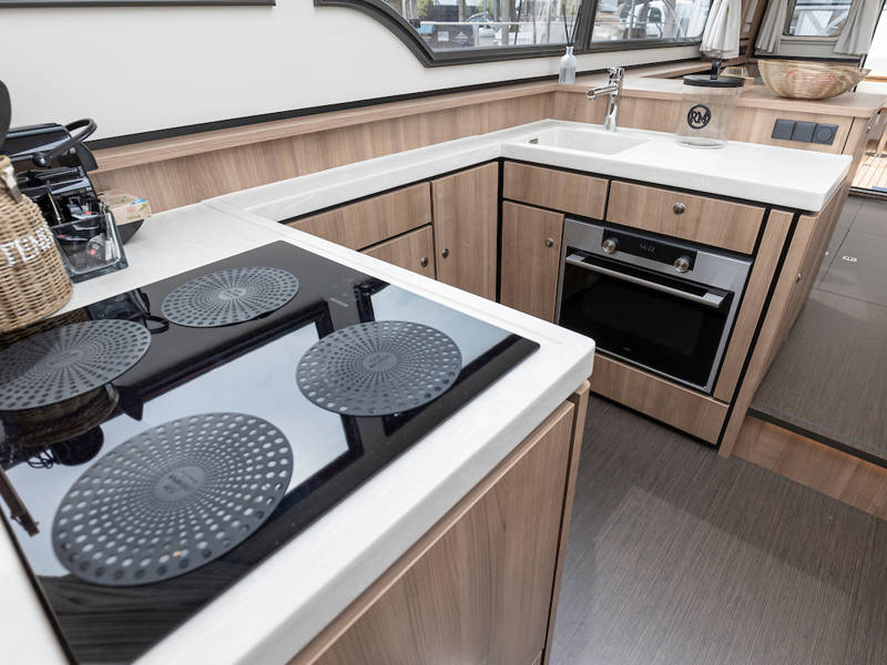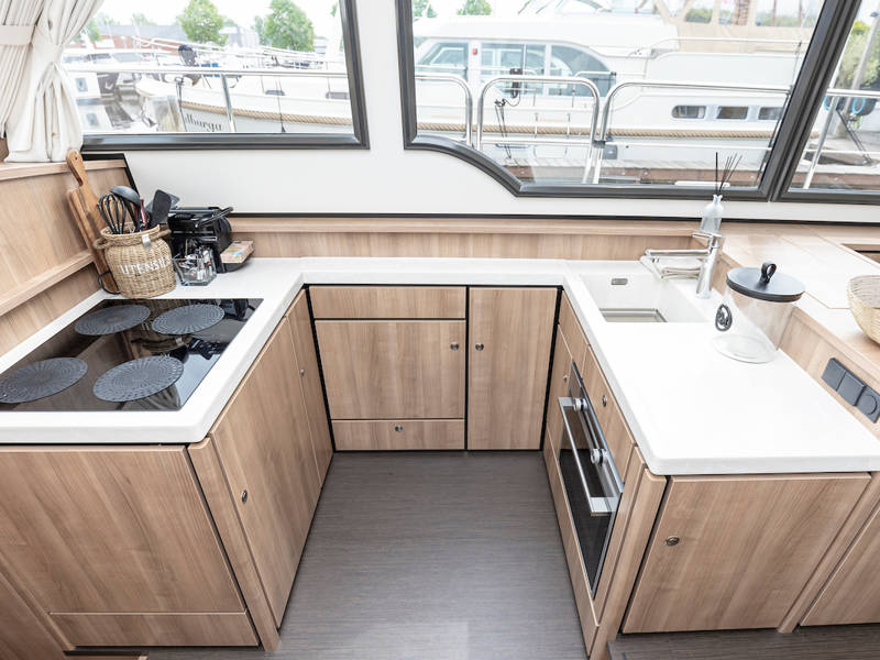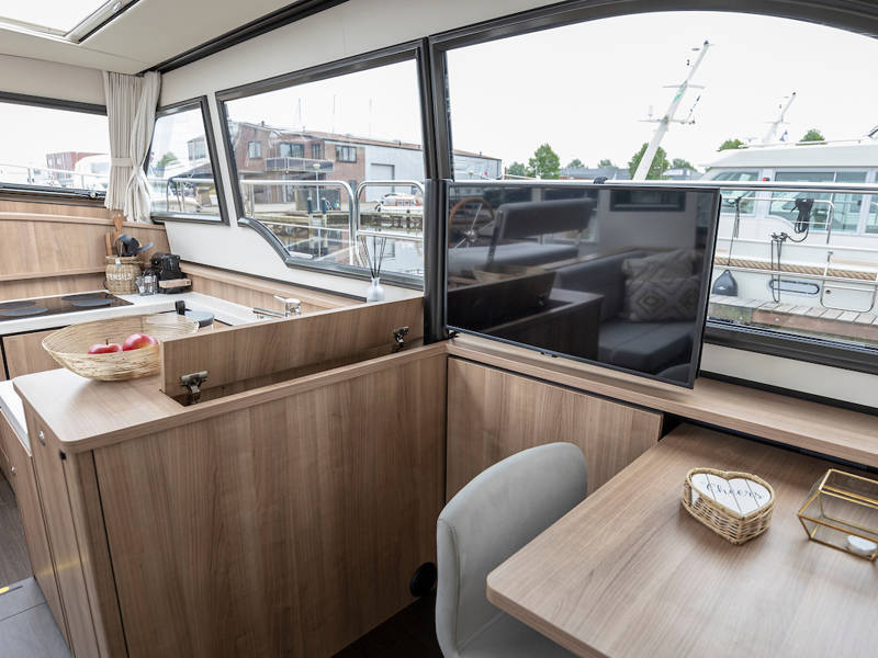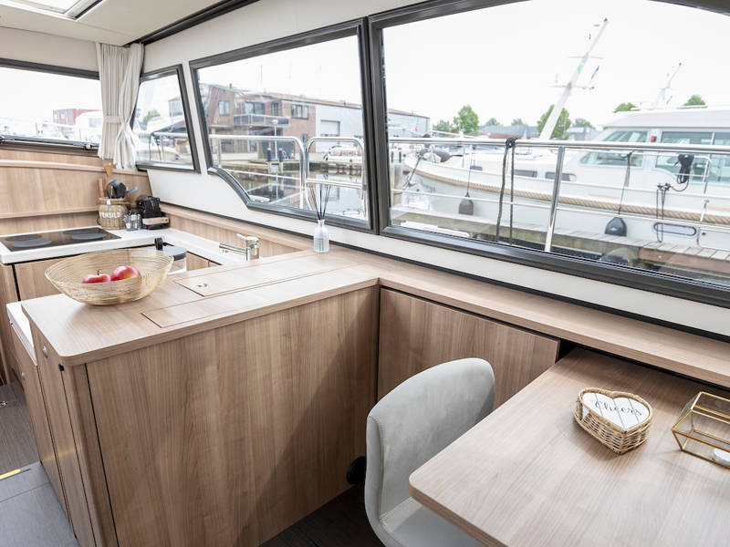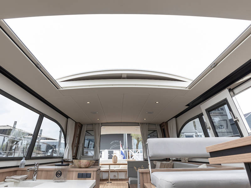 Het jacht is ingedeeld met 2 slaaphutten, twee badkamers, twee toiletten, uiteraard elektrisch en een ruime douche. In de salon is een easy-sleep-systeem, waar in een handomdraai een 2-persoonsbed van gemaakt kan worden.