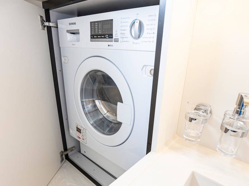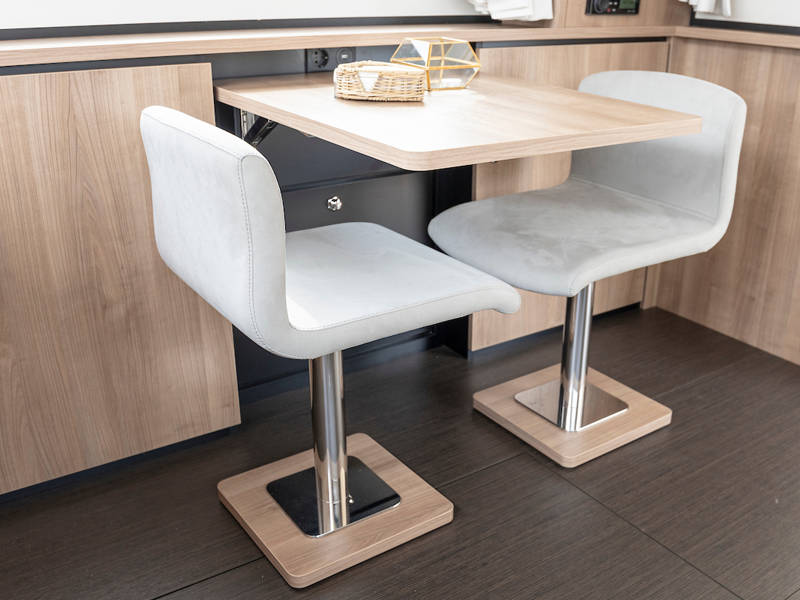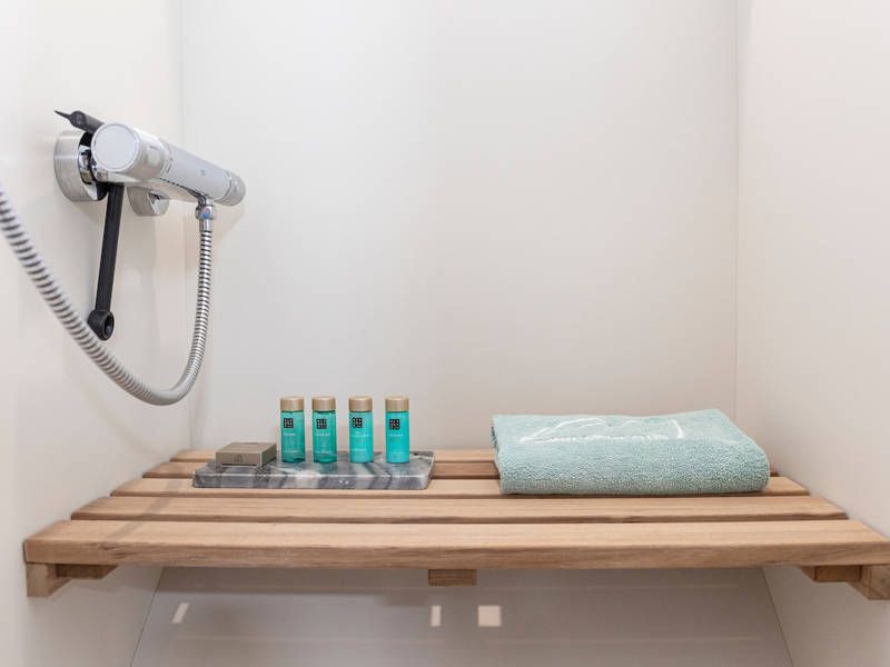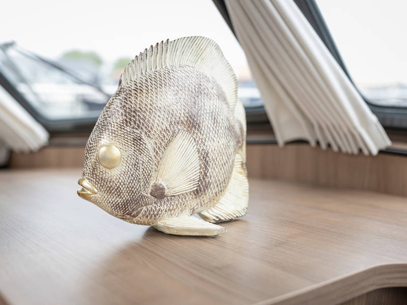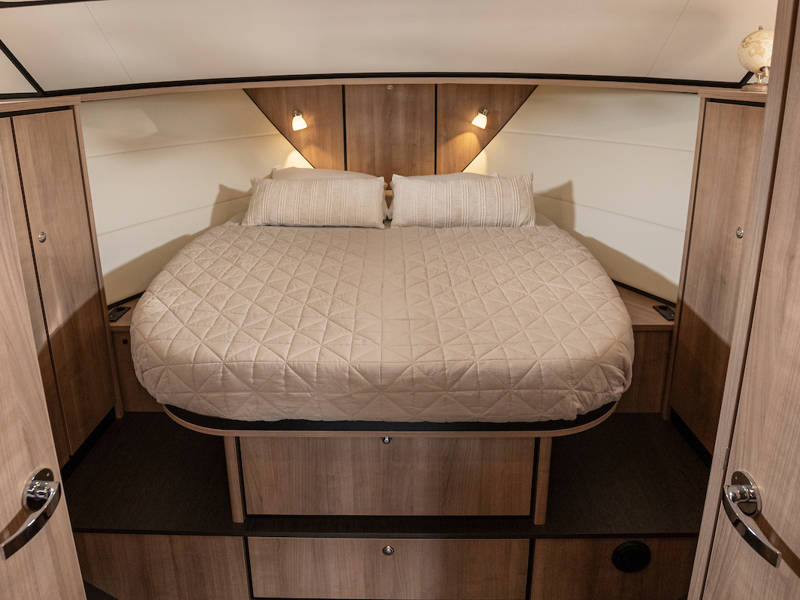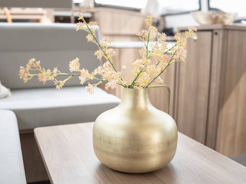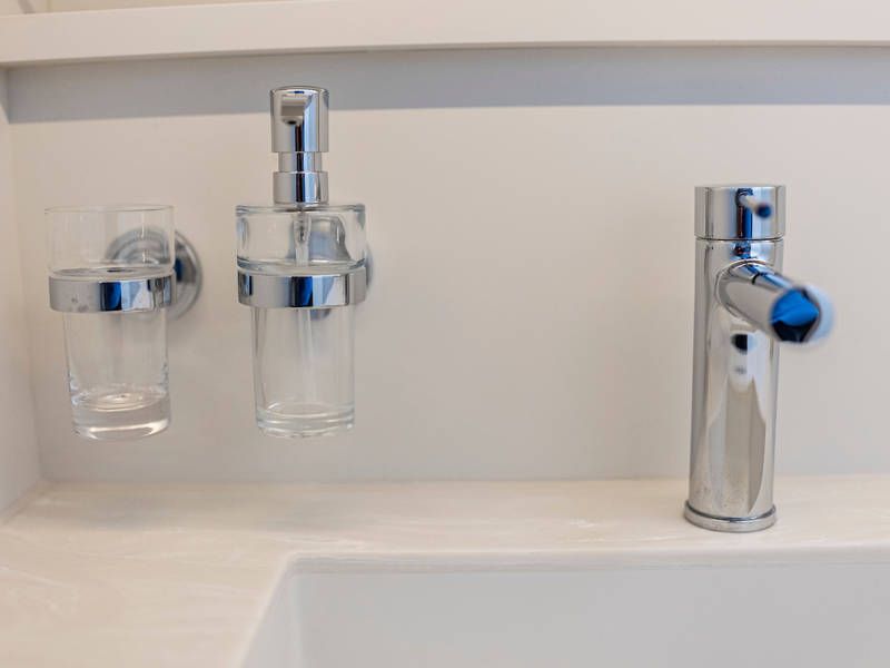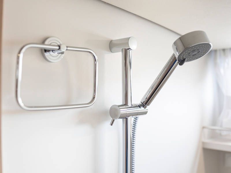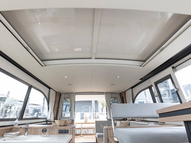Het jacht is ingedeeld met 2 slaaphutten, twee badkamers, twee toiletten, uiteraard elektrisch en een ruime douche. In de salon is een easy-sleep-systeem, waar in een handomdraai een 2-persoonsbed van gemaakt kan worden.