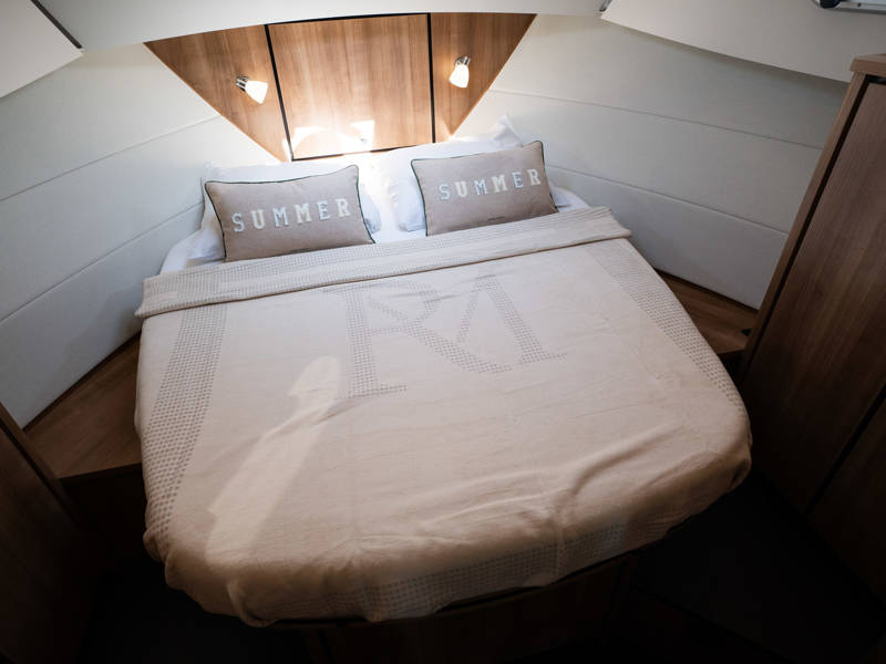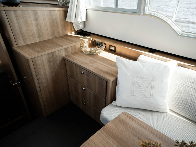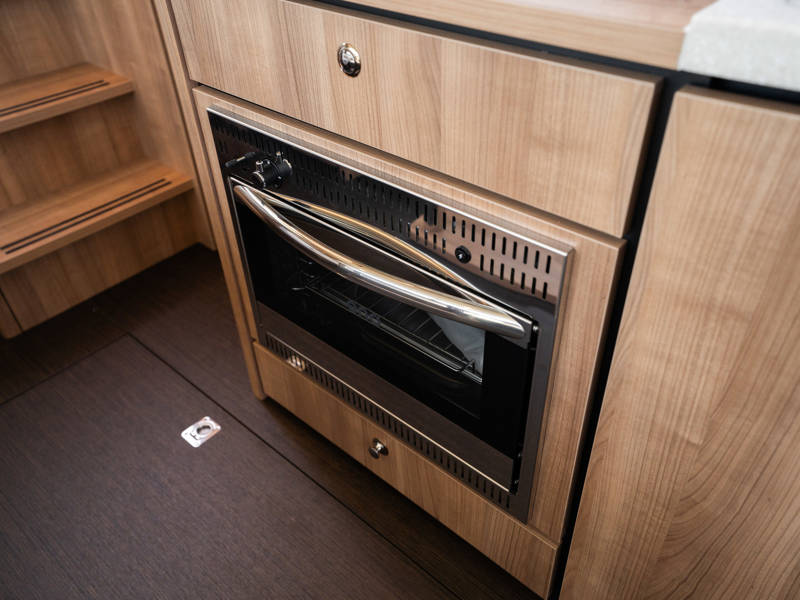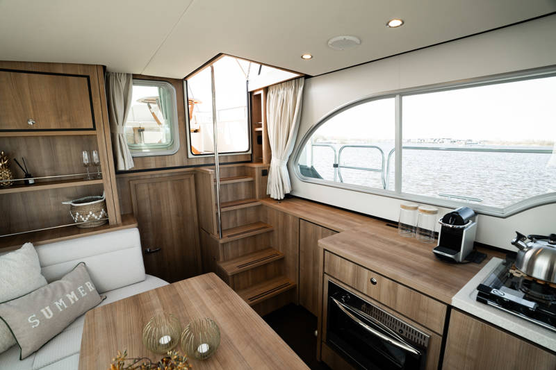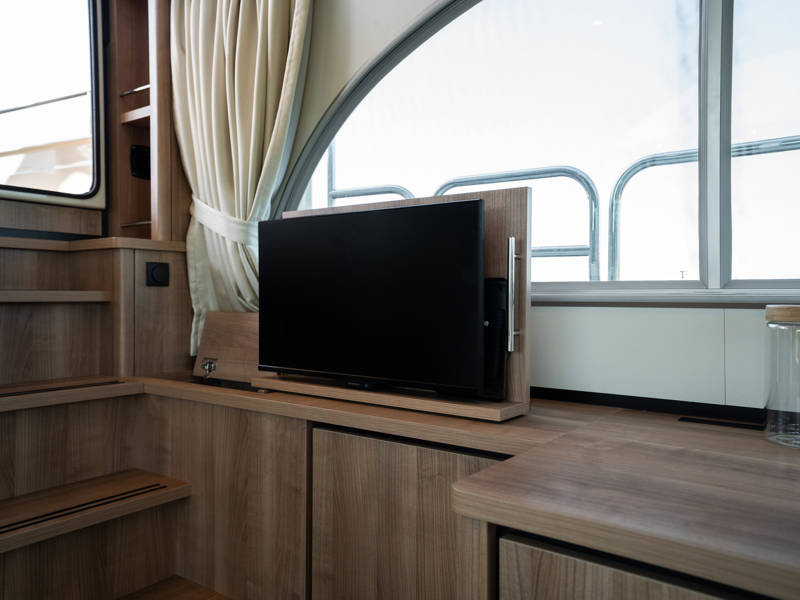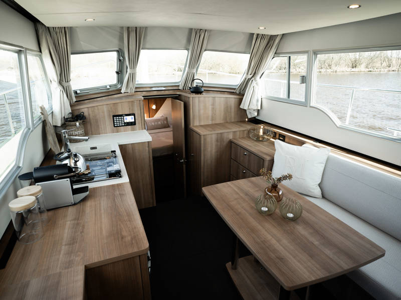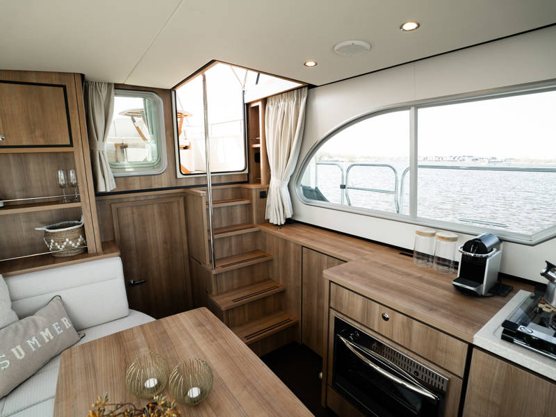 Het interieur kenmerkt zich door een uitgekiende indeling, gemaakt van luxe en heldere materialen zoals Corian-bladen en leder in een smaakvolle kleurstelling. In de ruime salon bevindt zich een compleet ingerichte keuken en een comfortabele zithoek met TV.