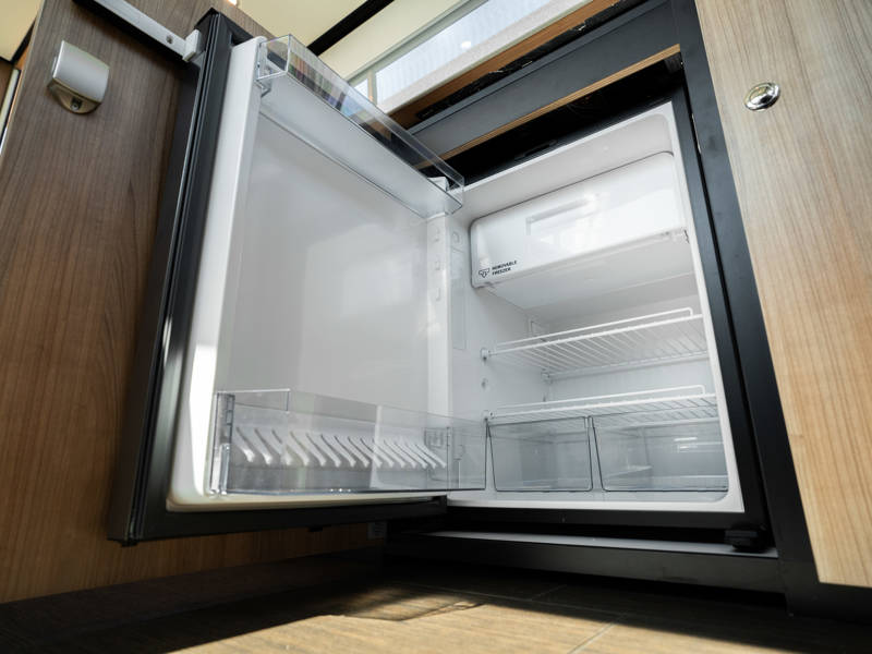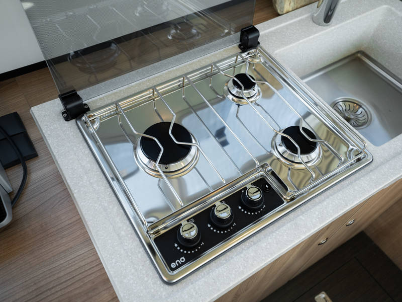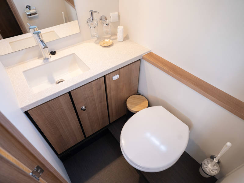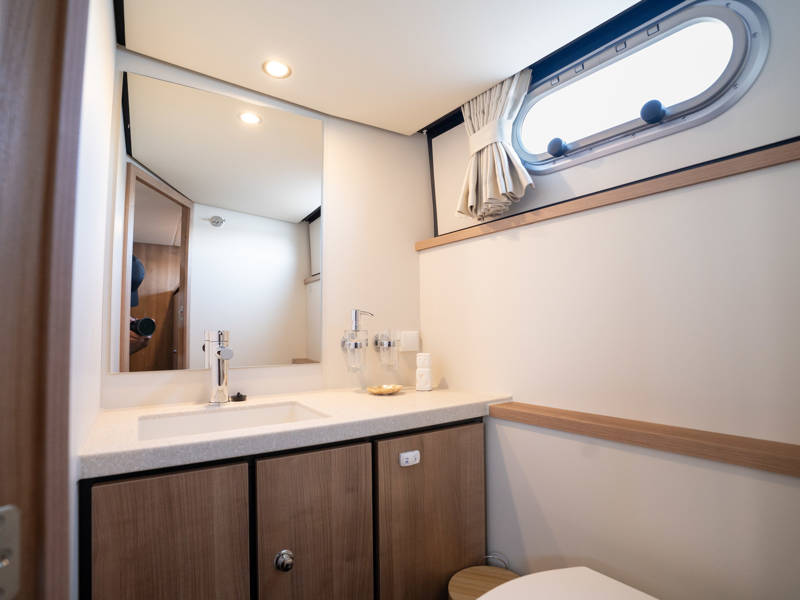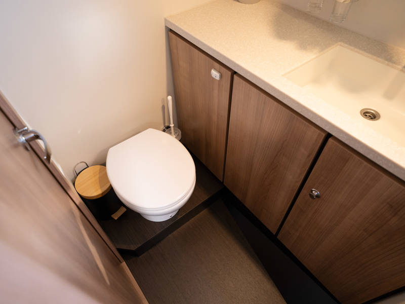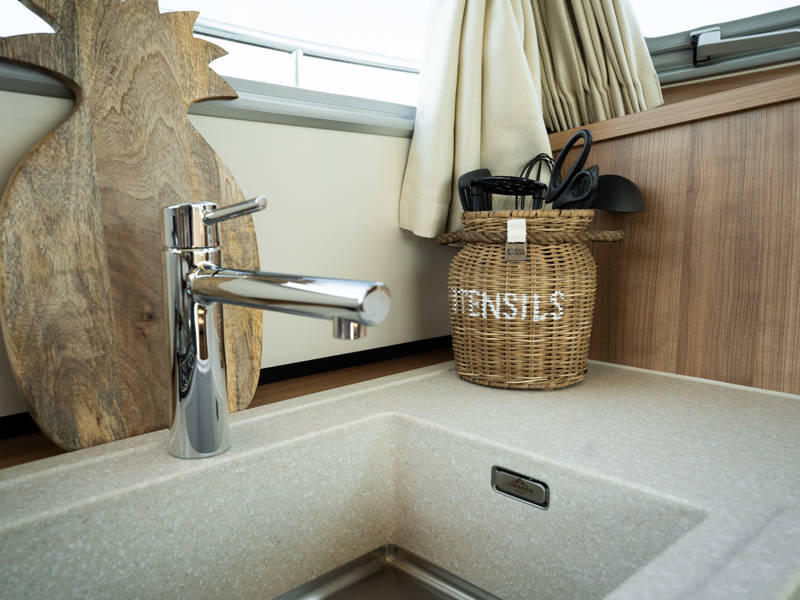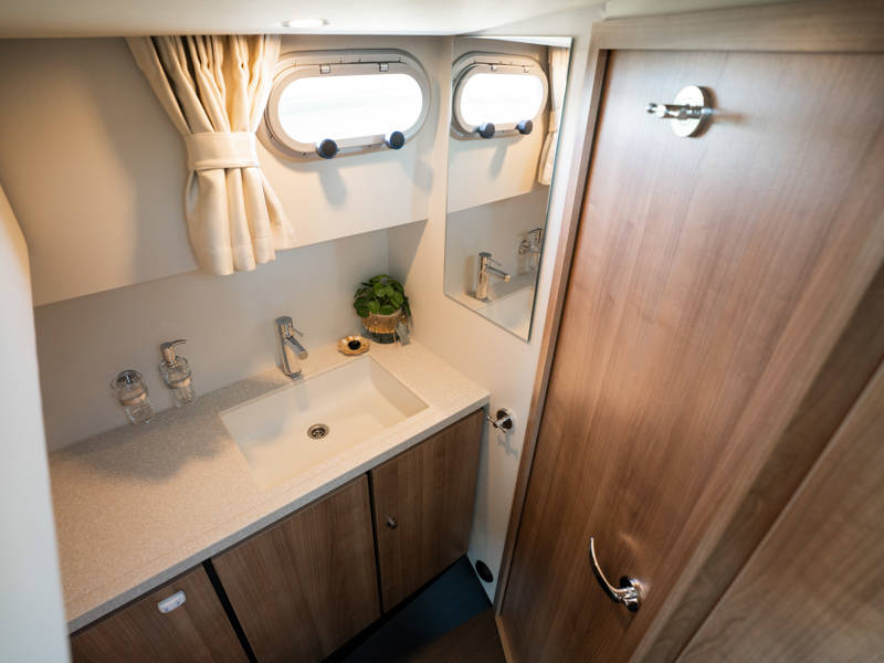 Het interieur kenmerkt zich door een uitgekiende indeling, gemaakt van luxe en heldere materialen zoals Corian-bladen en leder in een smaakvolle kleurstelling. In de ruime salon bevindt zich een compleet ingerichte keuken en een comfortabele zithoek met TV.