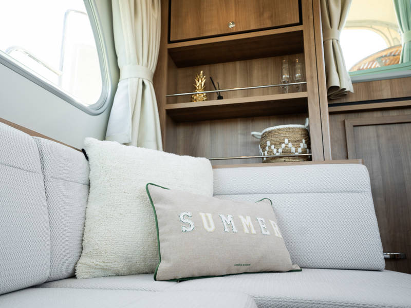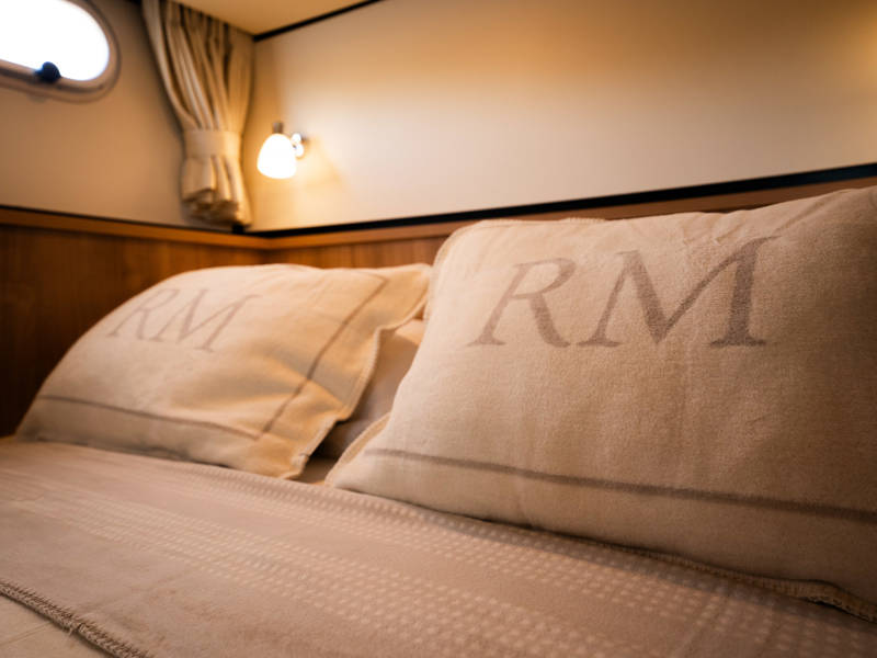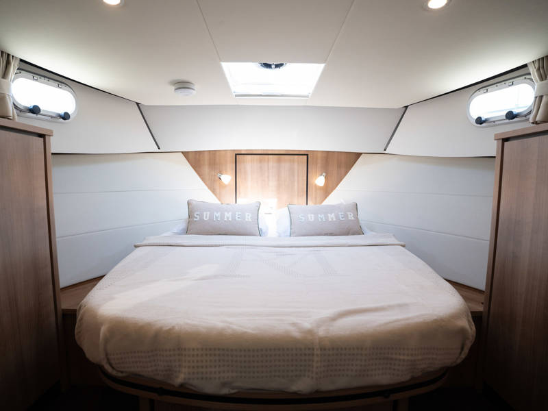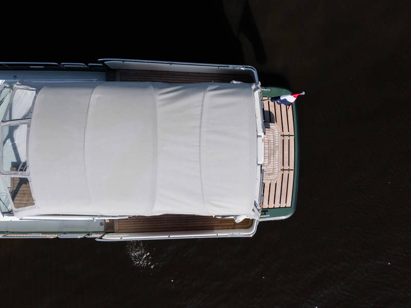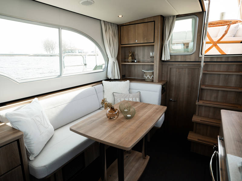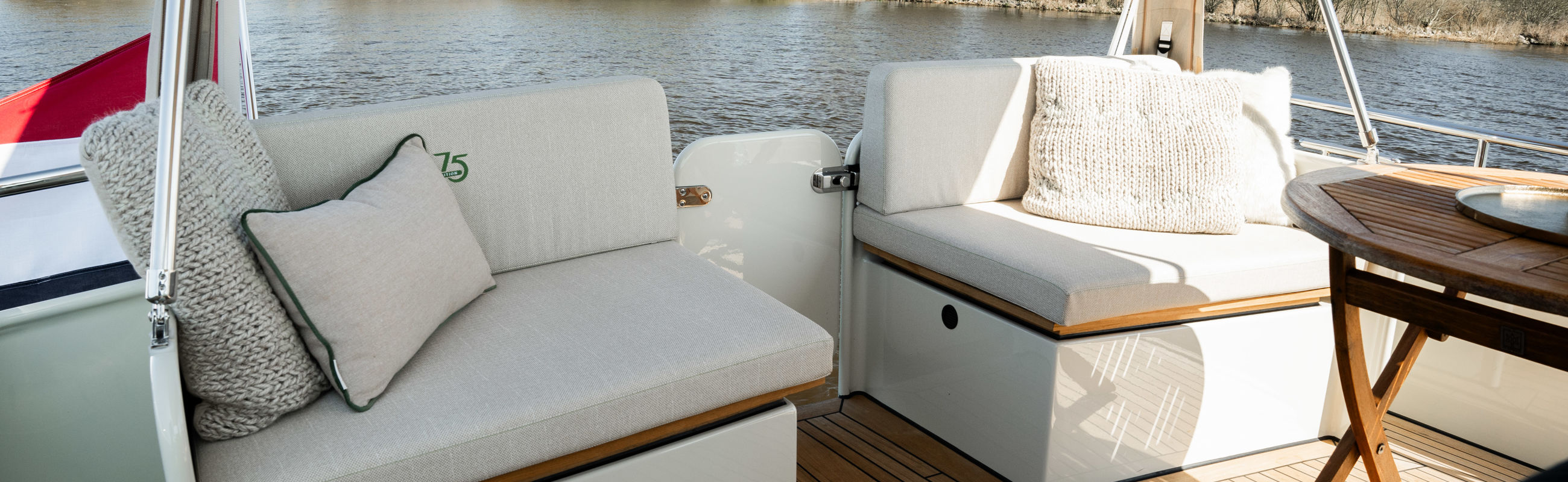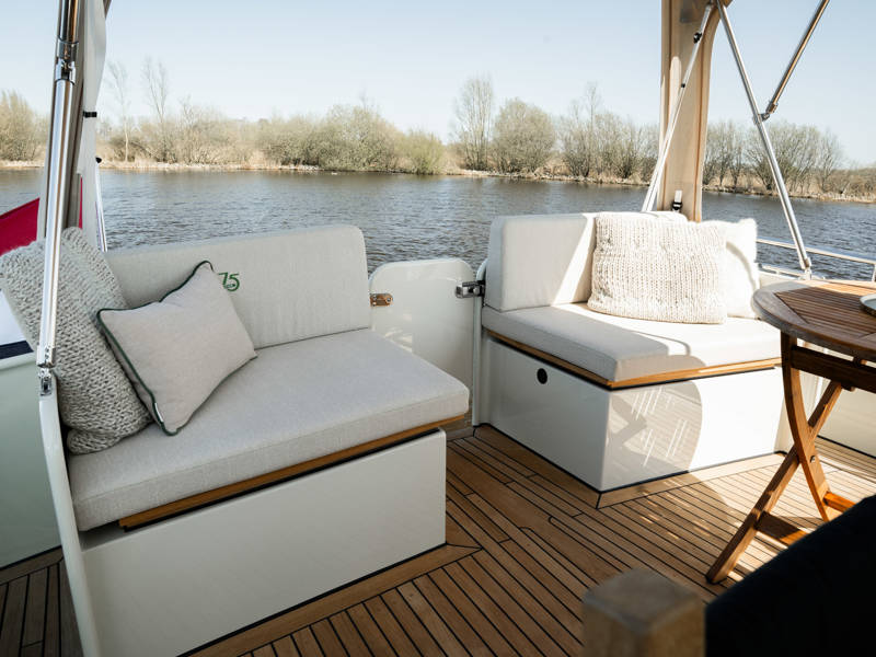 Aan dek is ruime zitplaats op de vaste bank met fijne kussens, en het achterdek is rondom de bank geheel afsluitbaar met een extra grote cabriotent.