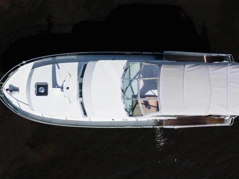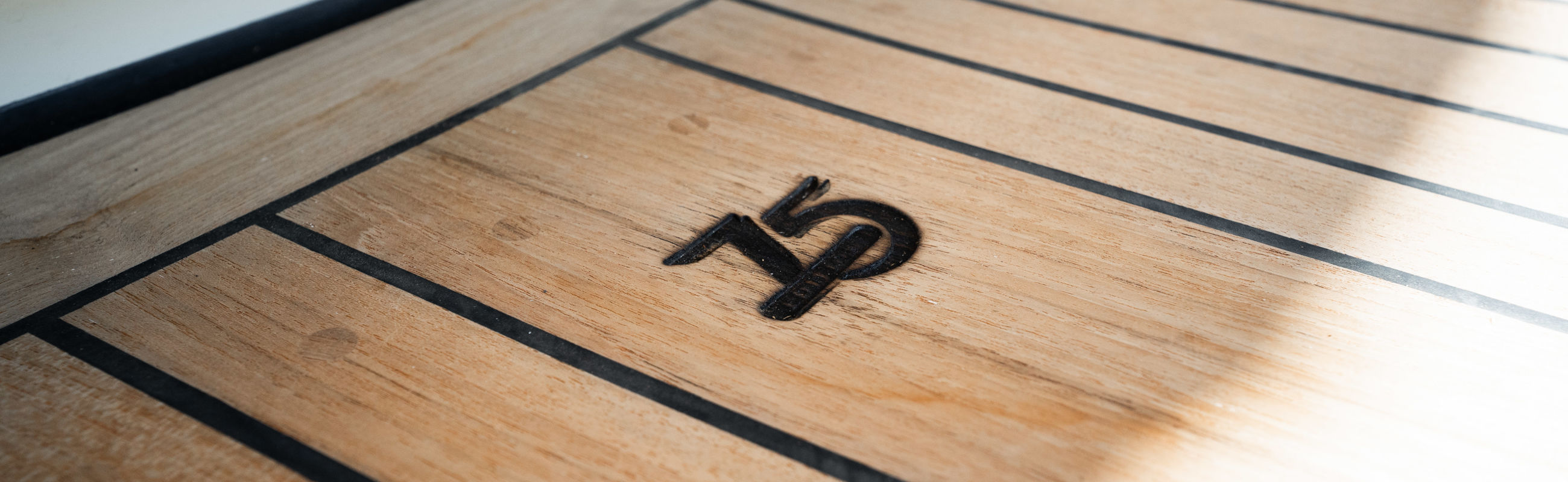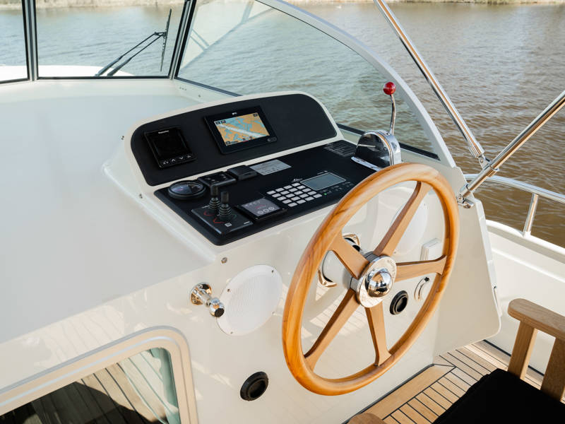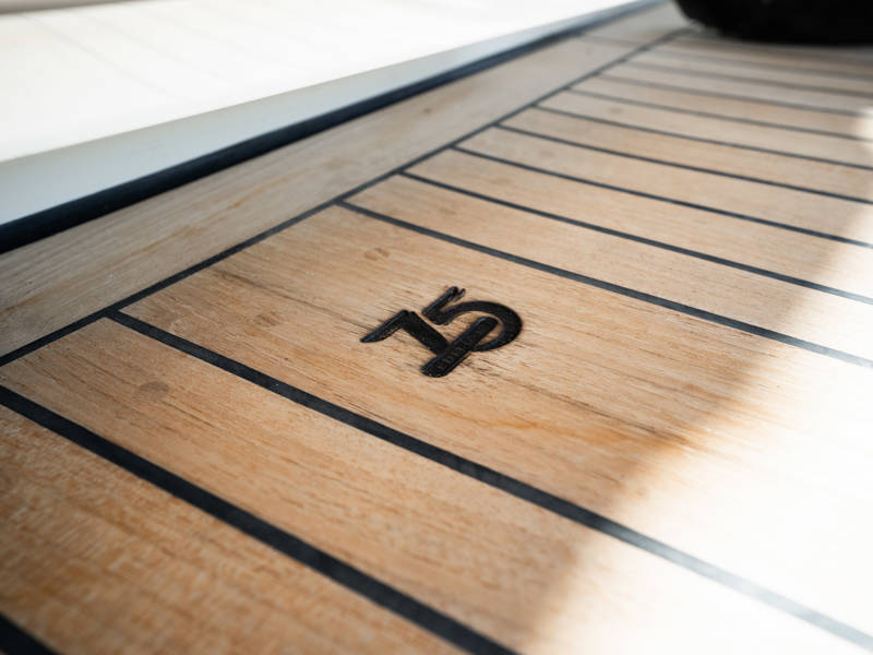 Het achterdek is uitgevoerd in echt teakhout, wat het jacht een luxe nautische allure geeft.