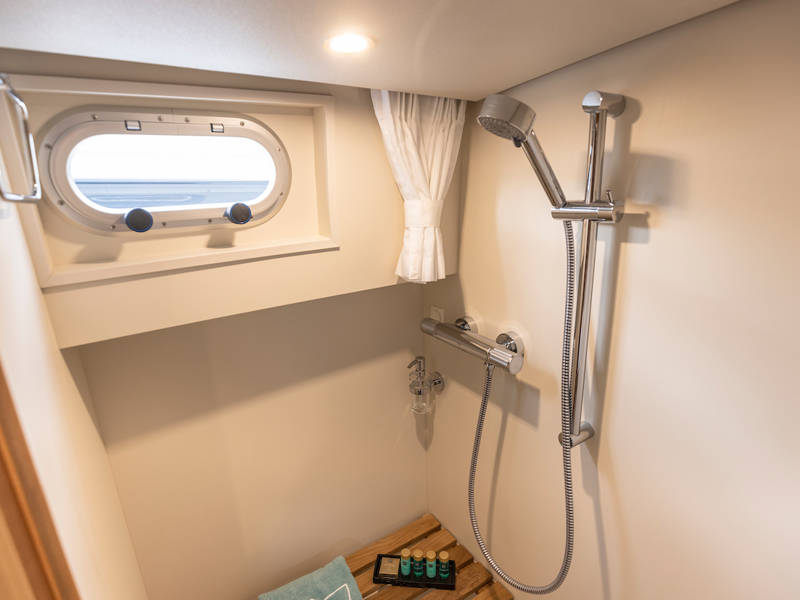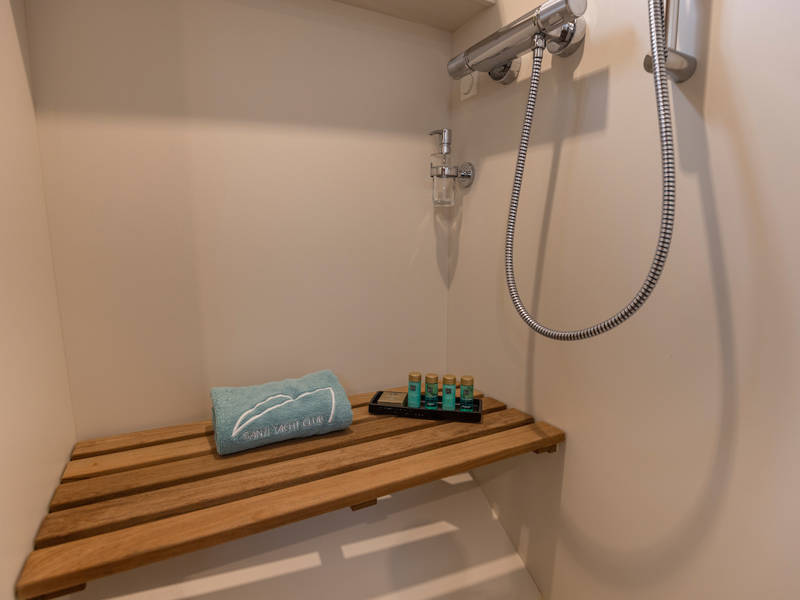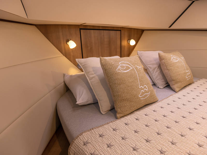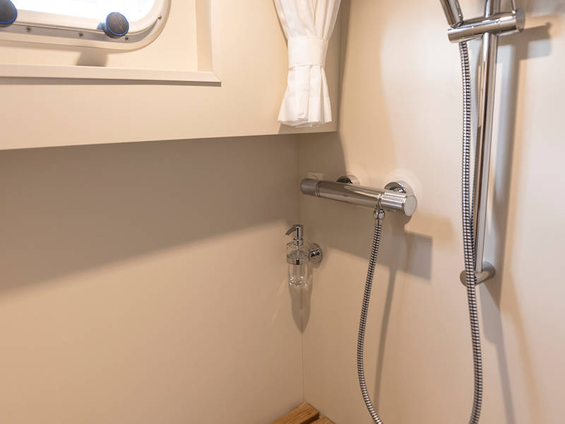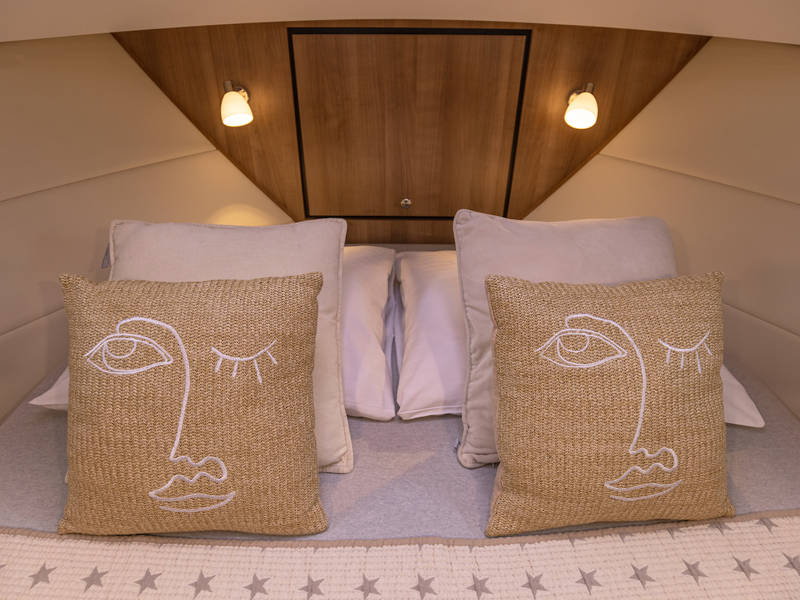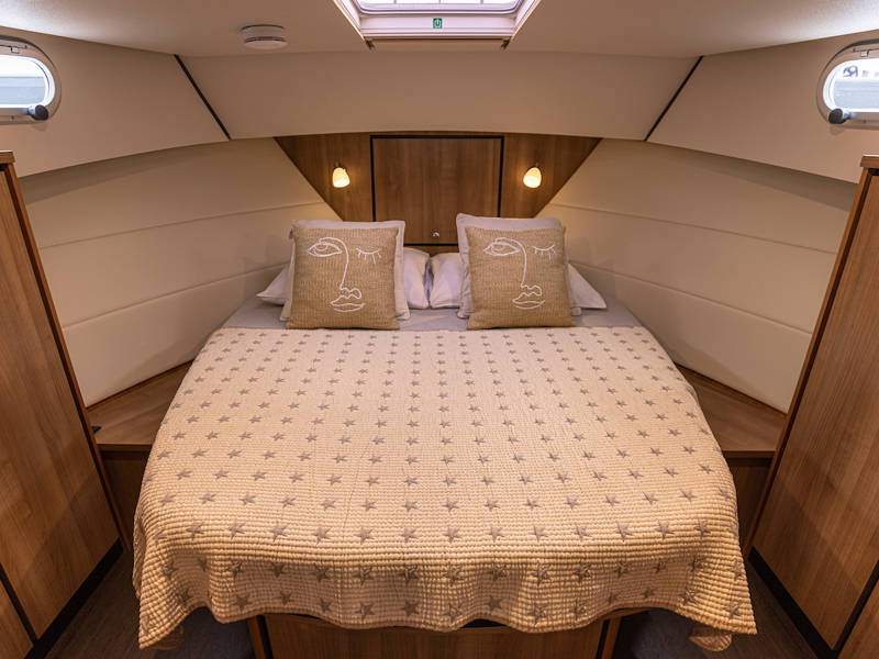 Op dit compacte jacht is verrassend veel ruimte! In de voorhut is een sfeervolle captains-cabin met een twee-persoonsbed, badkamer met elektrisch toilet en wastafel en een aparte natte cel met een douche.