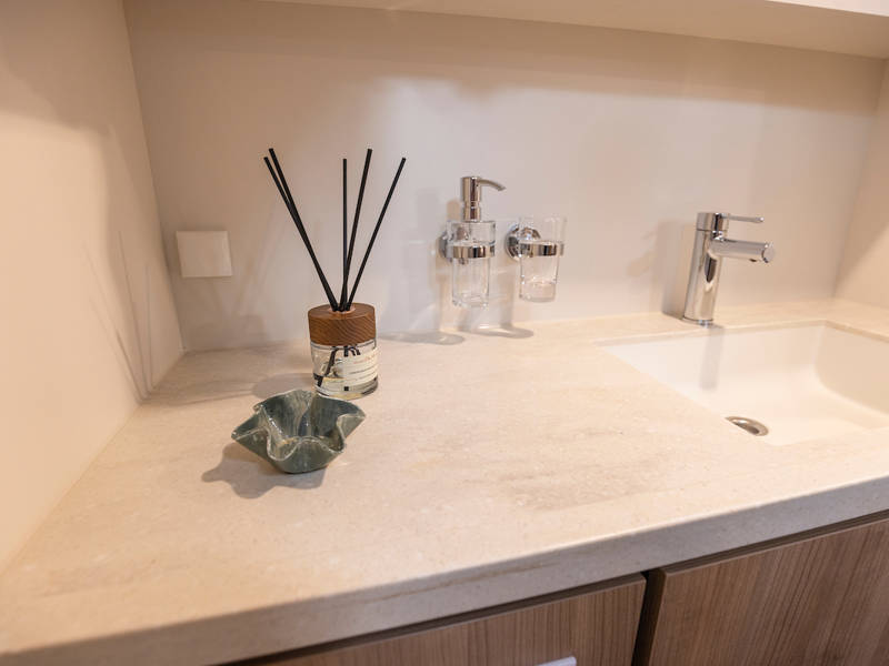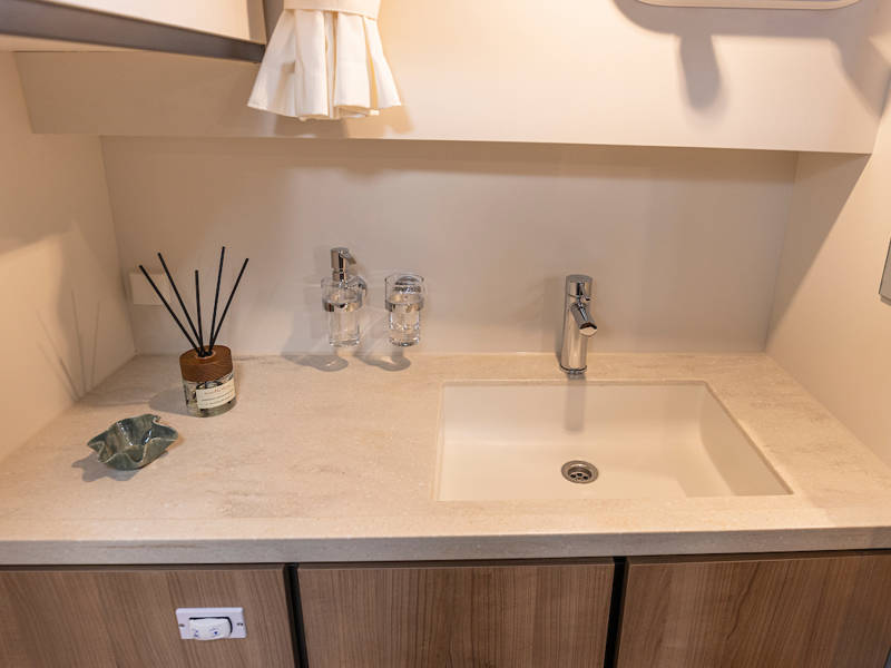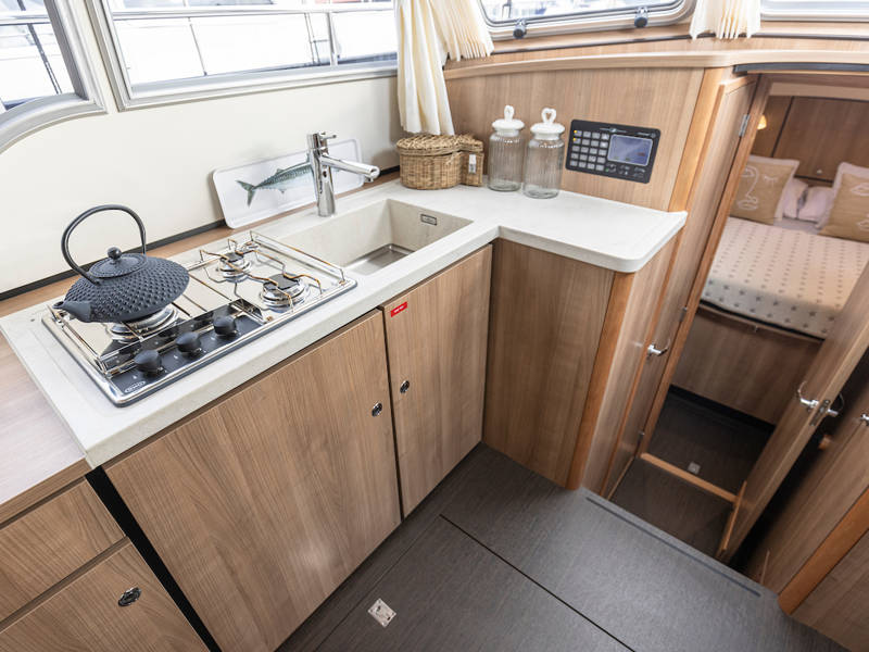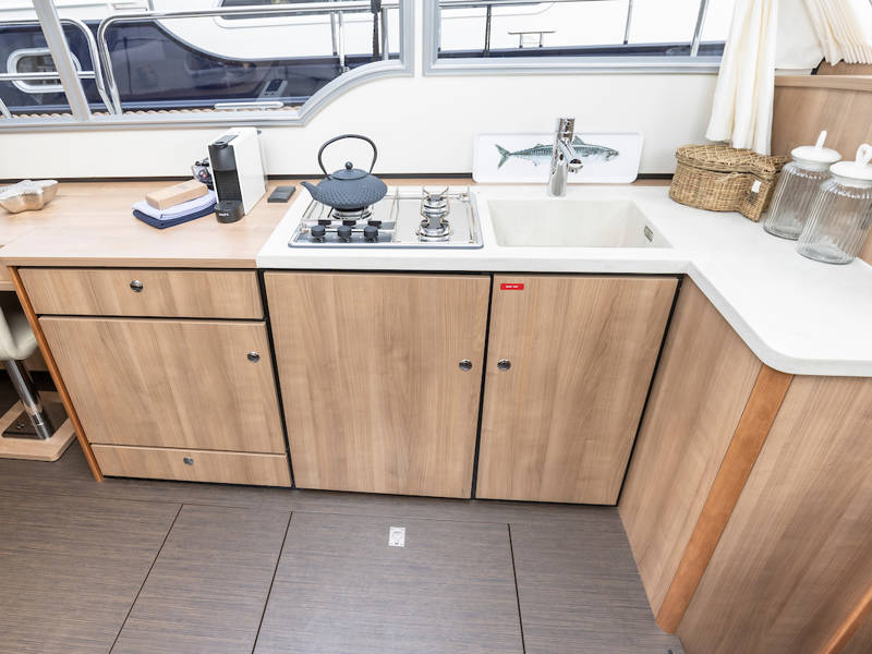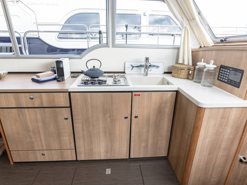 De keuken is aan bakboordzijde en volledig uitgerust met o.a. een kooktoestel, Nespressoapparaat en een complete keukeninventaris.