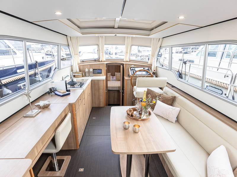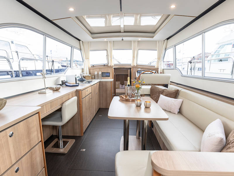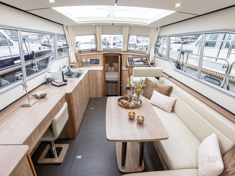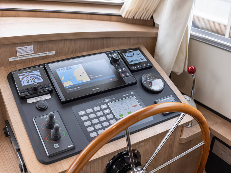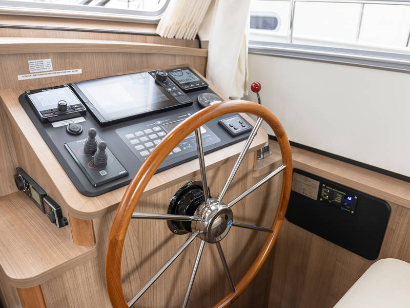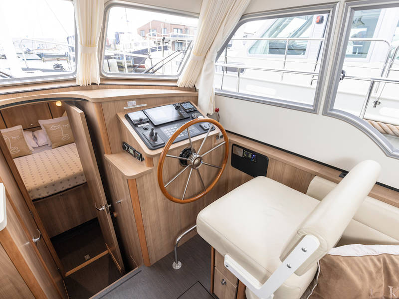 Aan stuurboordzijde is de stuurpositie en dashboard welke is uitgerust met een compleet navigatiepakket. Boven de keuken en de stuurstand is een scheepsbreed schuifluik, wat het ' buiten sturen gevoel' benadrukt.