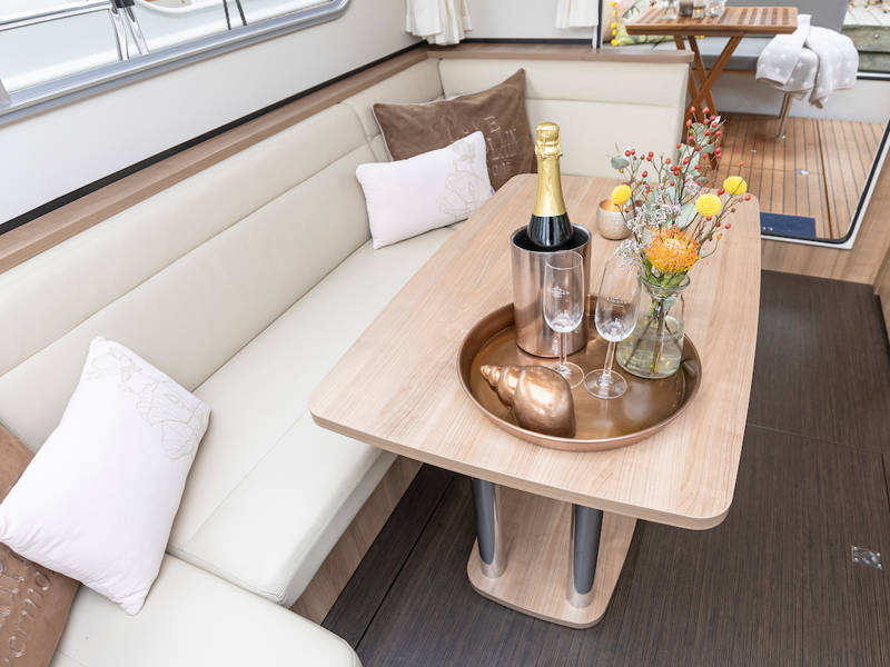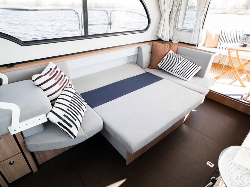 Deze boot is uitgerust met een EasySleep-systeem in de bank, waarmee u in een handomdraai de zitbank omtovert tot een comfortabel bed (voorbeeld van ander jacht).