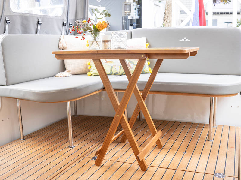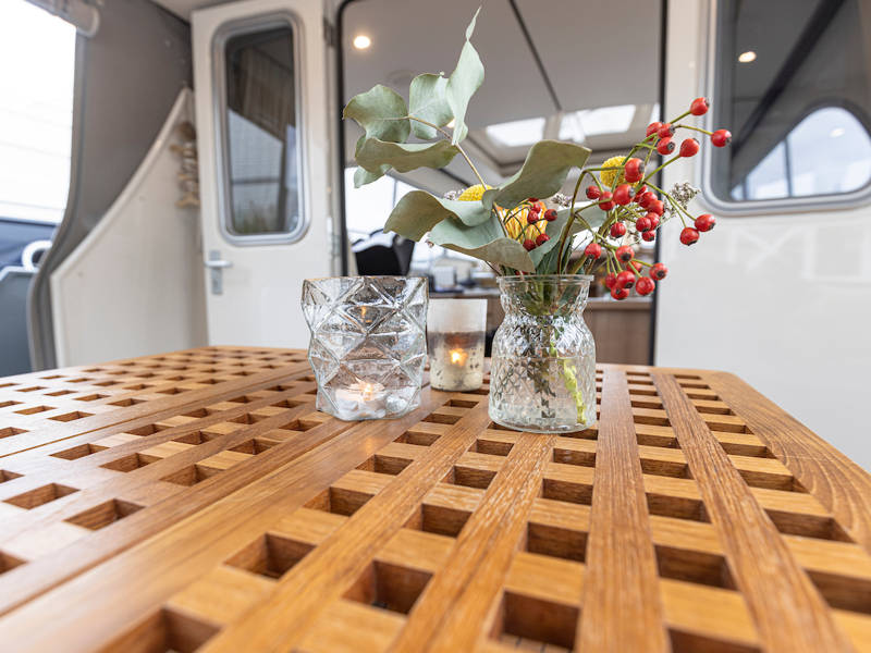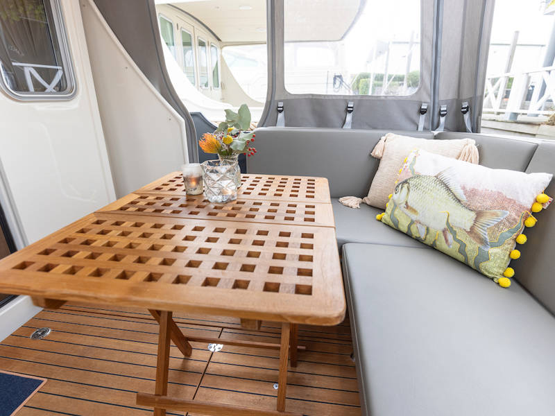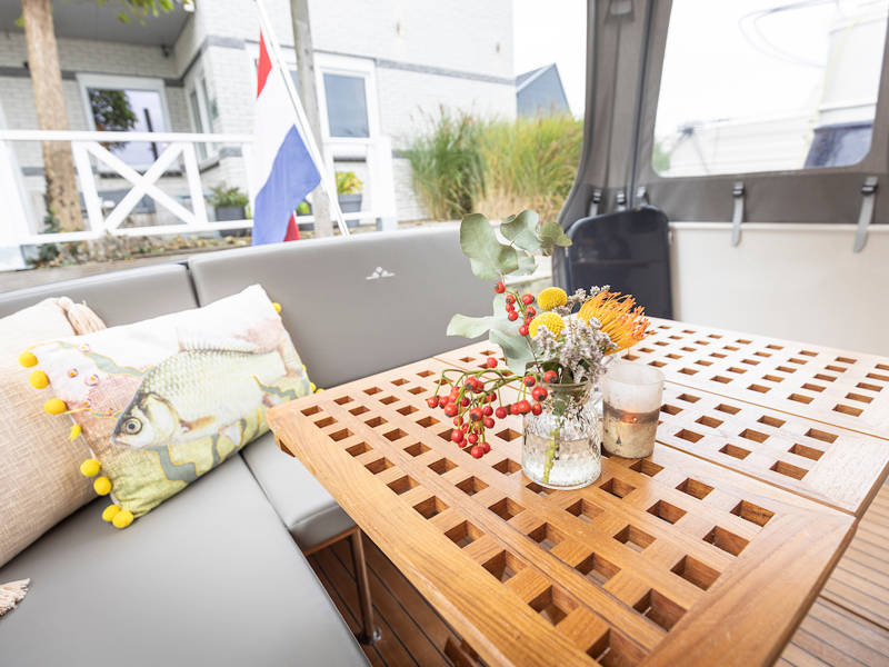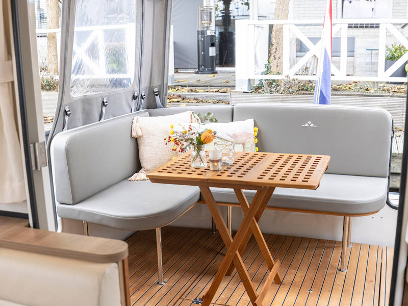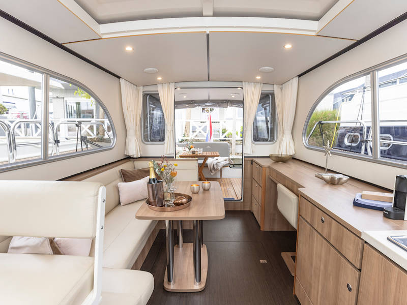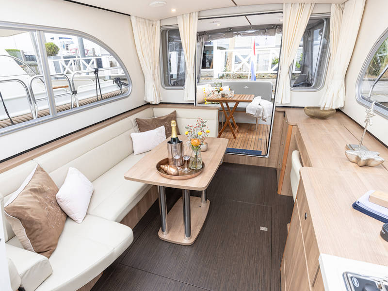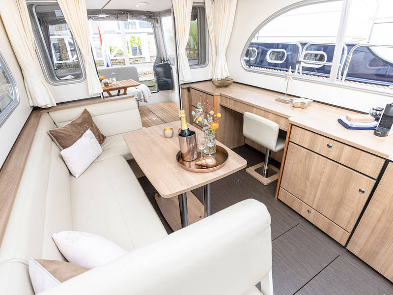 De salon is uitgerust met grote openslaande deuren welke toegang geven tot de open kuip, waar een royale zitbank is. Deze kuip is afsluitbaar en verwarmbaar, voor veel gezellige uurtjes aan boord.