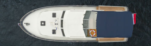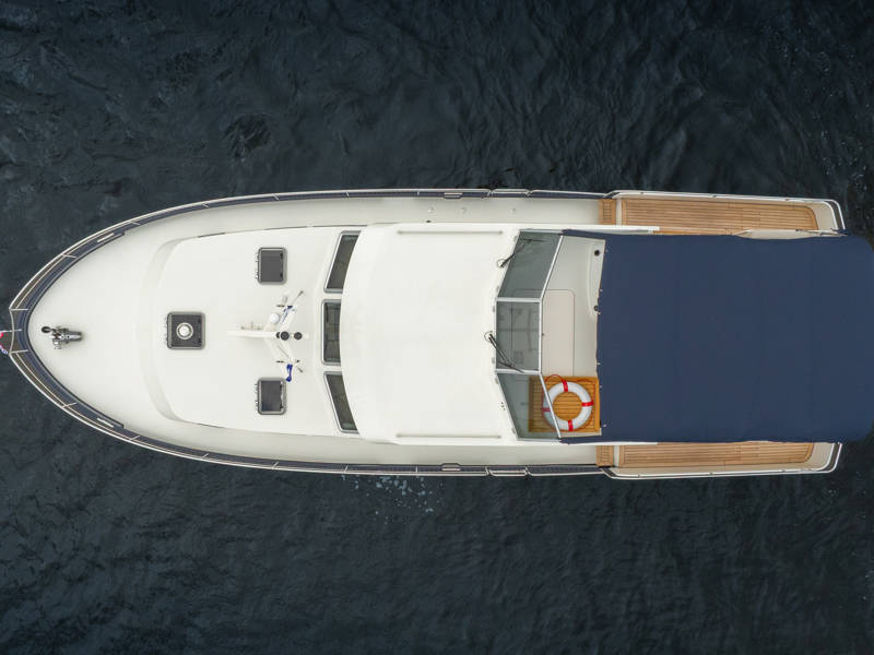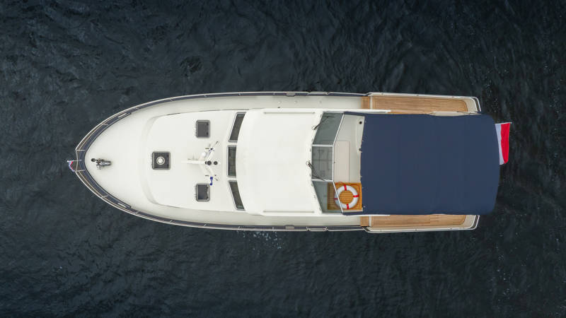 Het elegante exterieur is zeer herkenbaar door de rondom lopende kabelaring, wat dit motorjacht een echt maritiem karakter geeft.