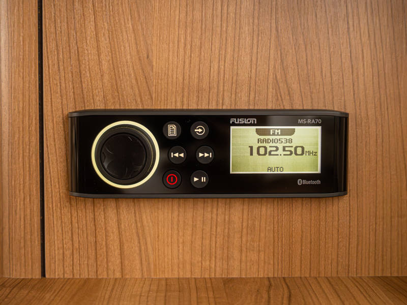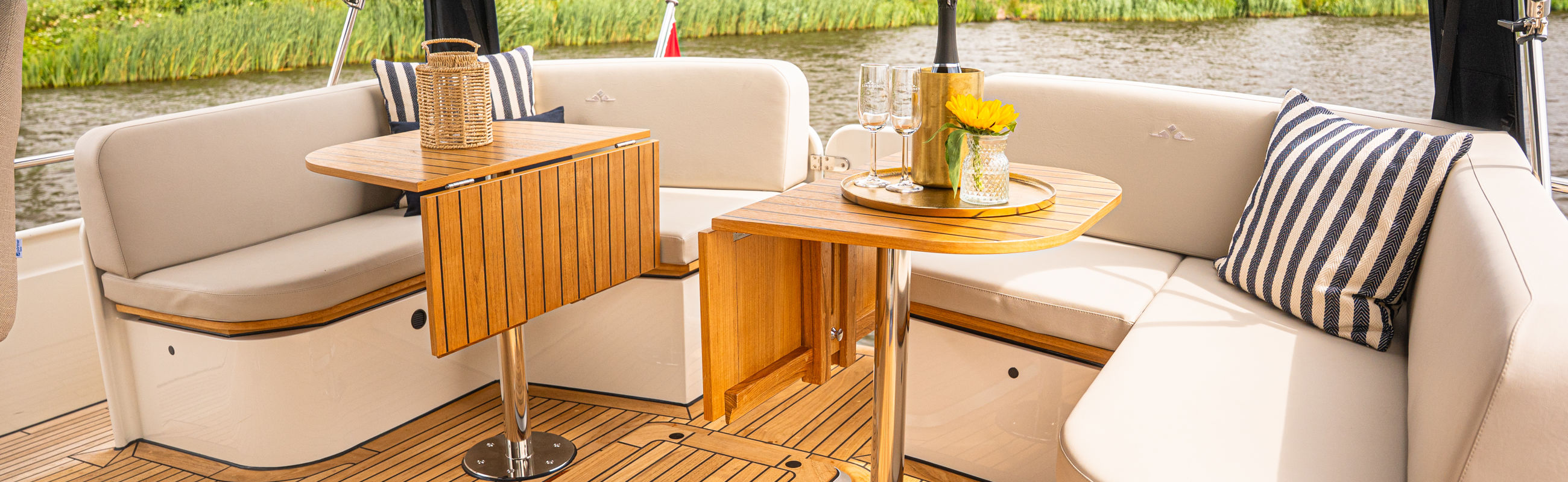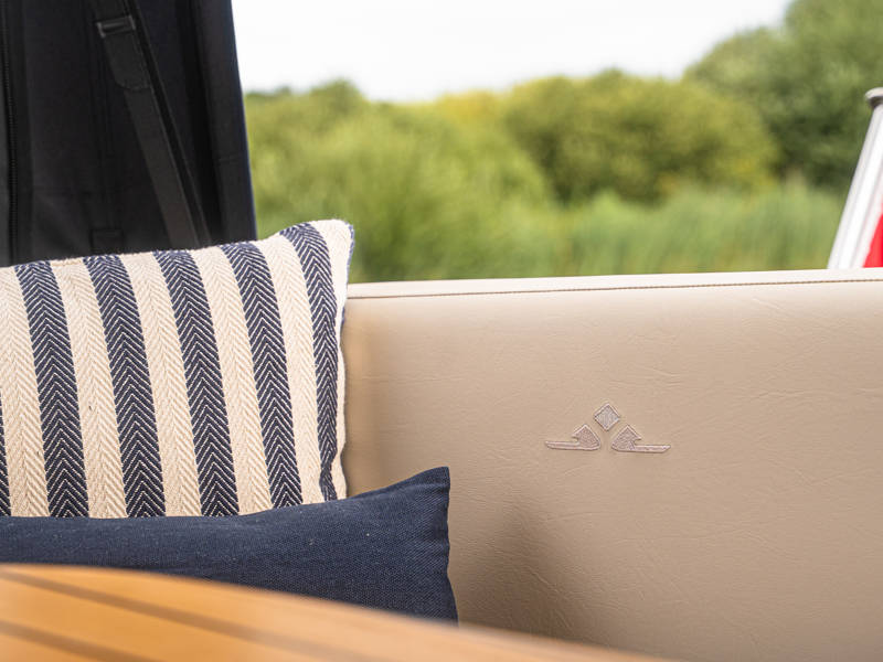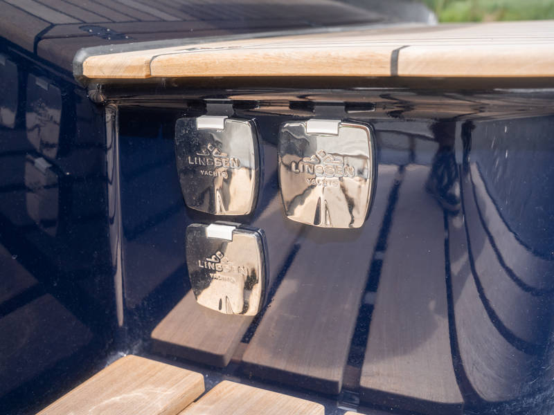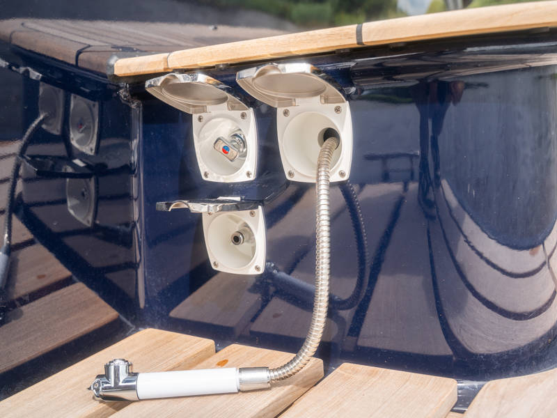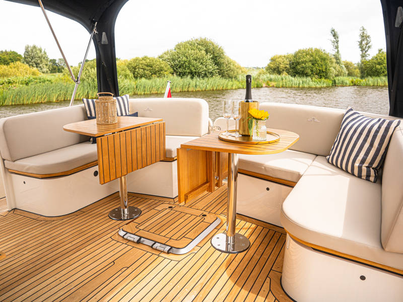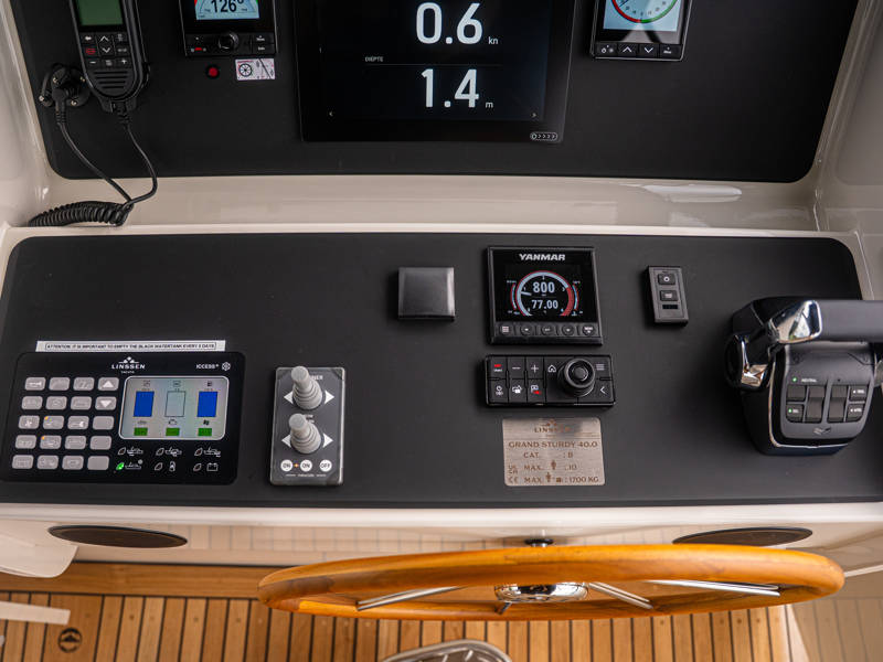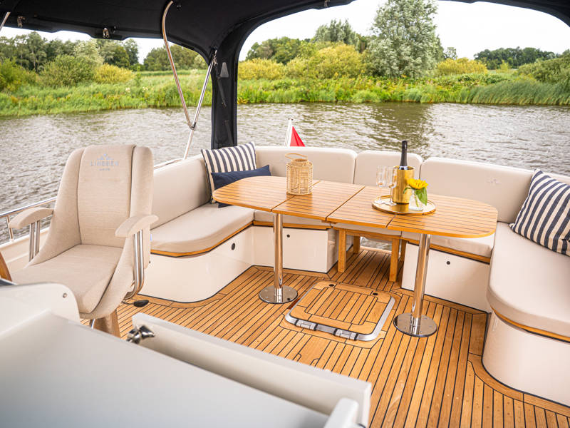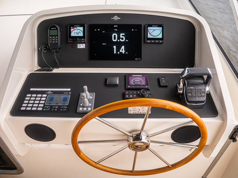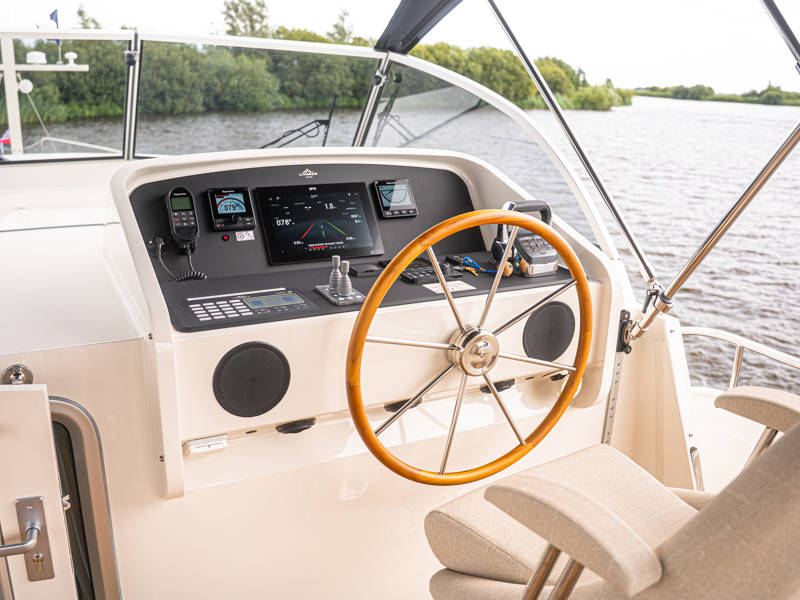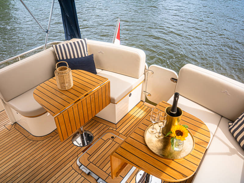 Het achterdek is uitgevoerd in echt teakhout, wat het jacht luxe nautische allure geeft. De verstelbare stuurstoel biedt perfect zitcomfort aan de schipper.