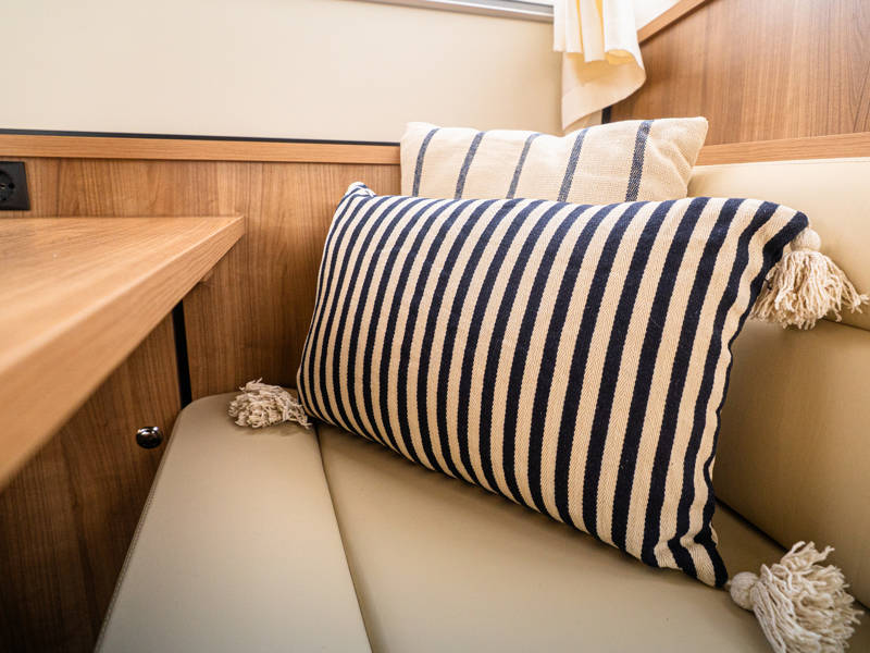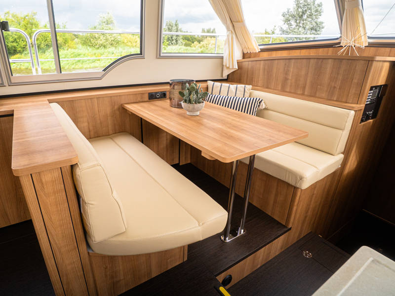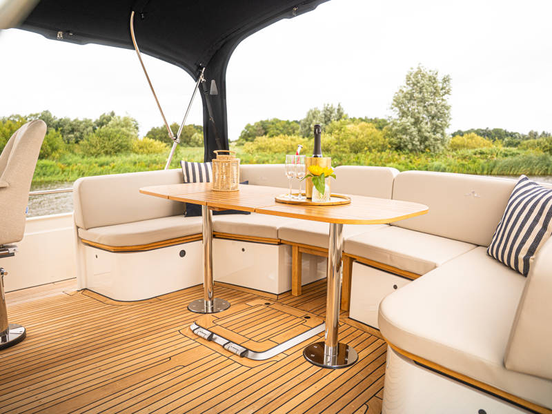 Aan dek is ruim zitplaats op de vaste hoekbank met fijne kussens en vaste eettafel.