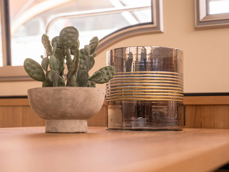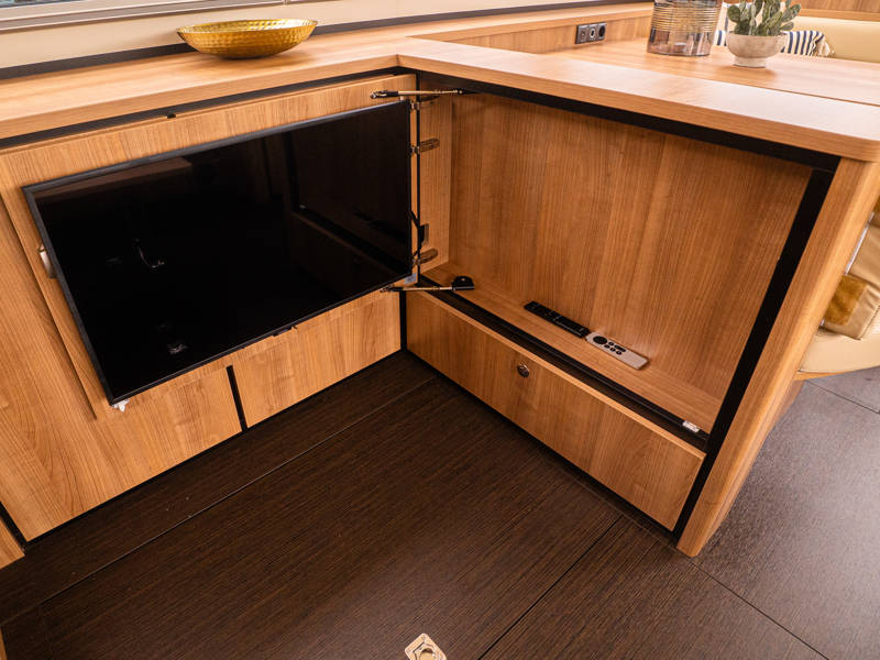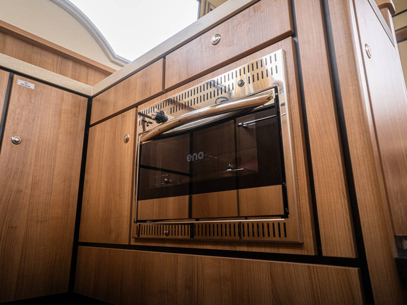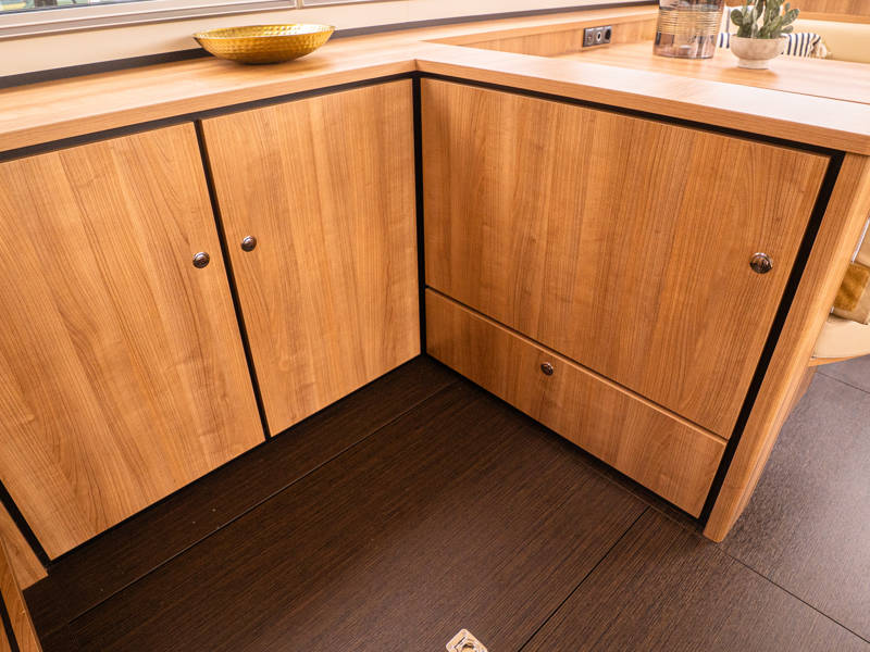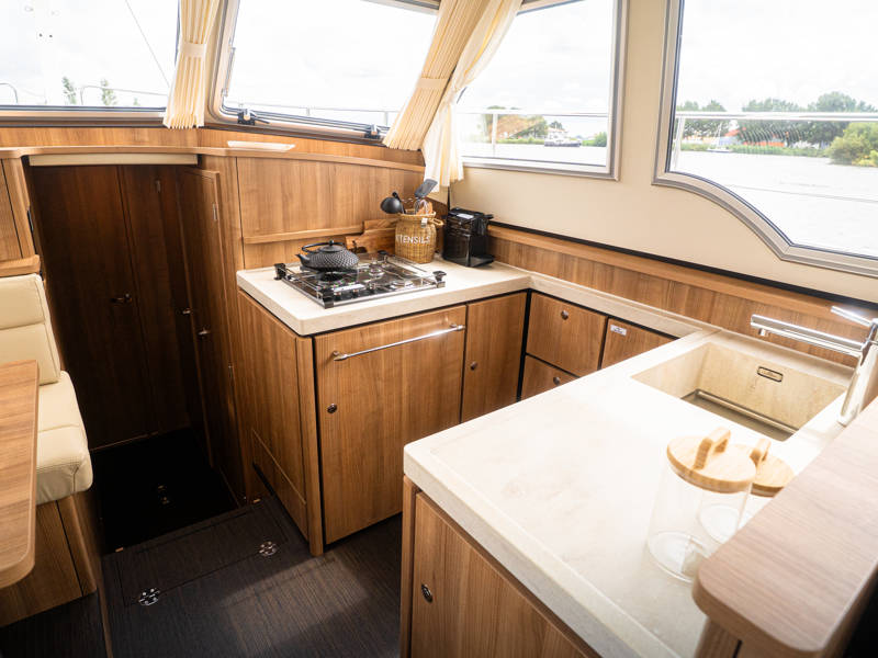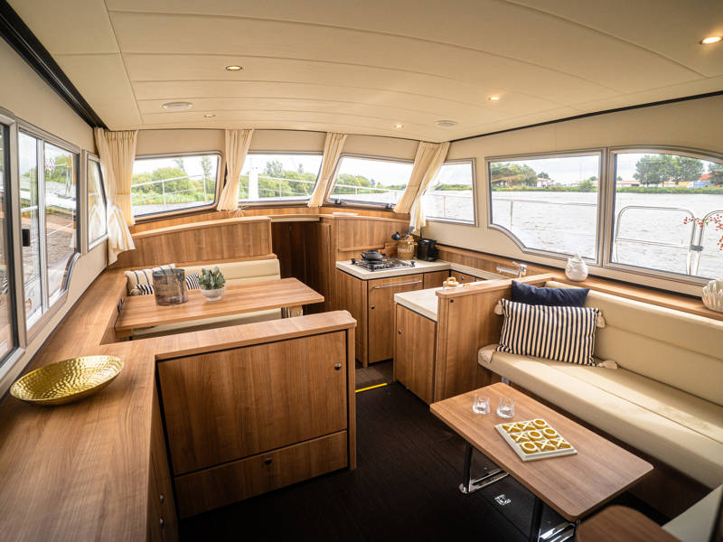 Het interieur kenmerkt zich door een uitgekiende indeling gemaakt van luxe moderne materialen zoals Corian bladen en leder in een lichte smaakvolle kleurstelling. Tegenover de keuken is een mooie eethoek (dinette) met veel lichtinval.