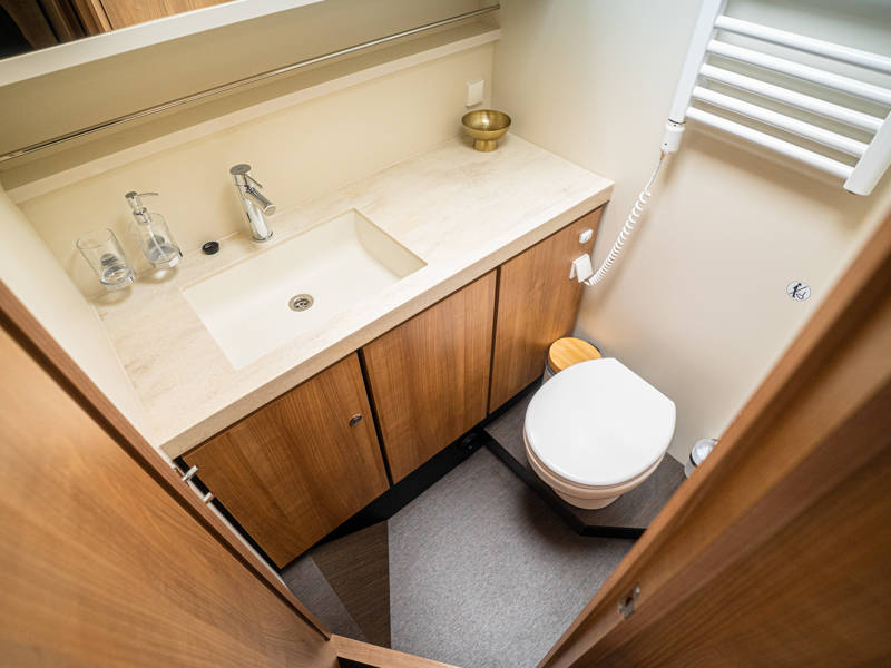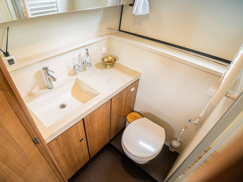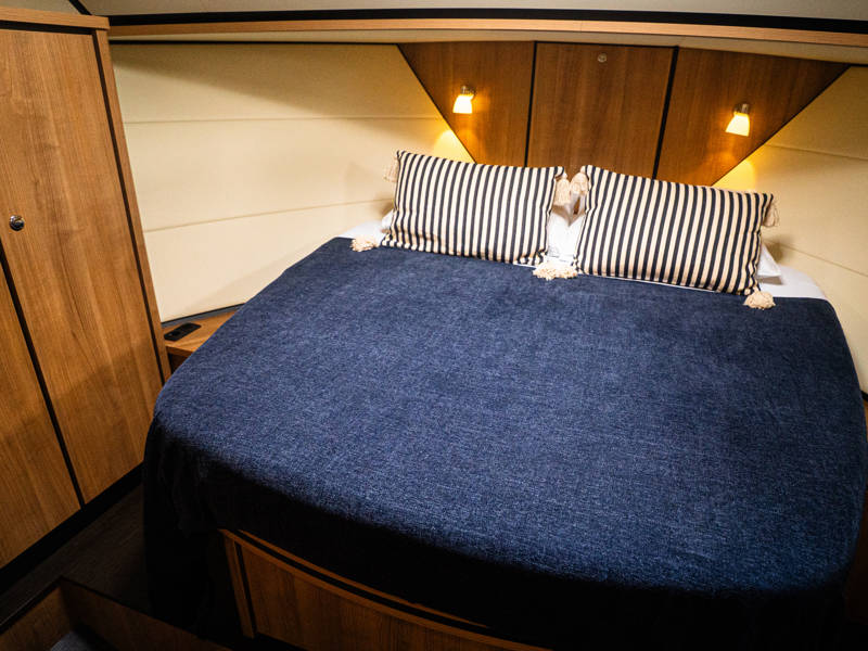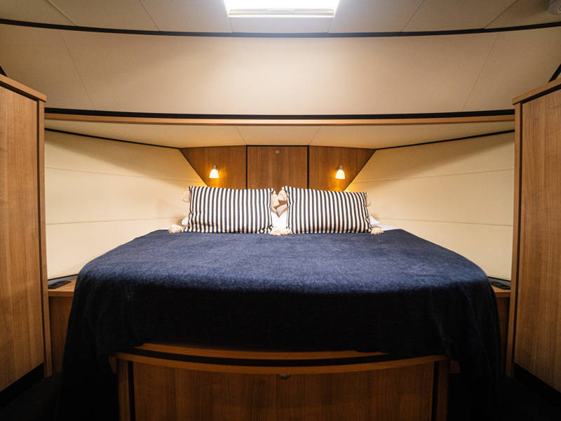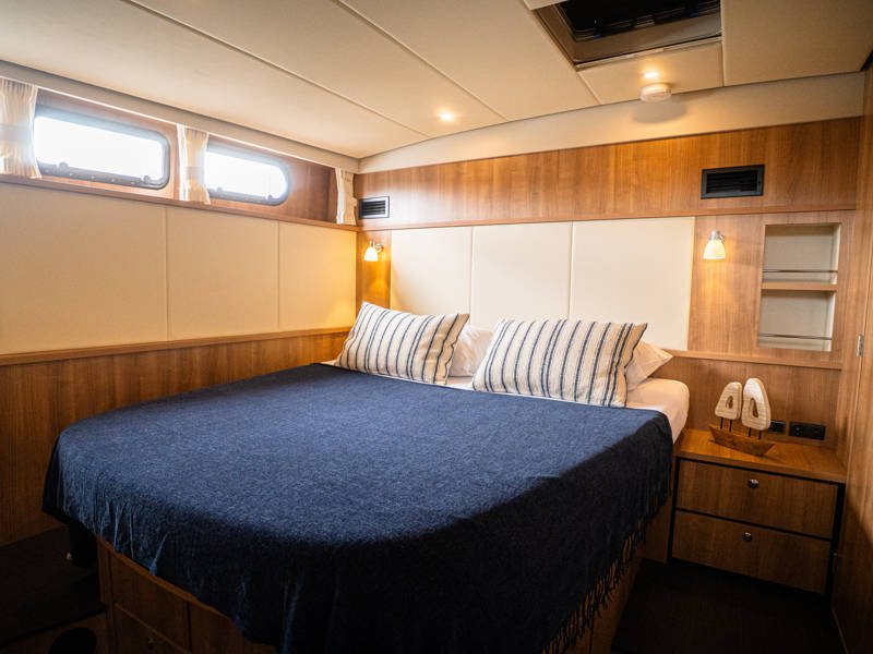 De Linssen Grand Sturdy 40.0 AC is een royaal jacht ingedeeld met twee gelijkwaardige hutten met elk een twee-persoonsbed en twee badkamers en twee elektrische toiletten.