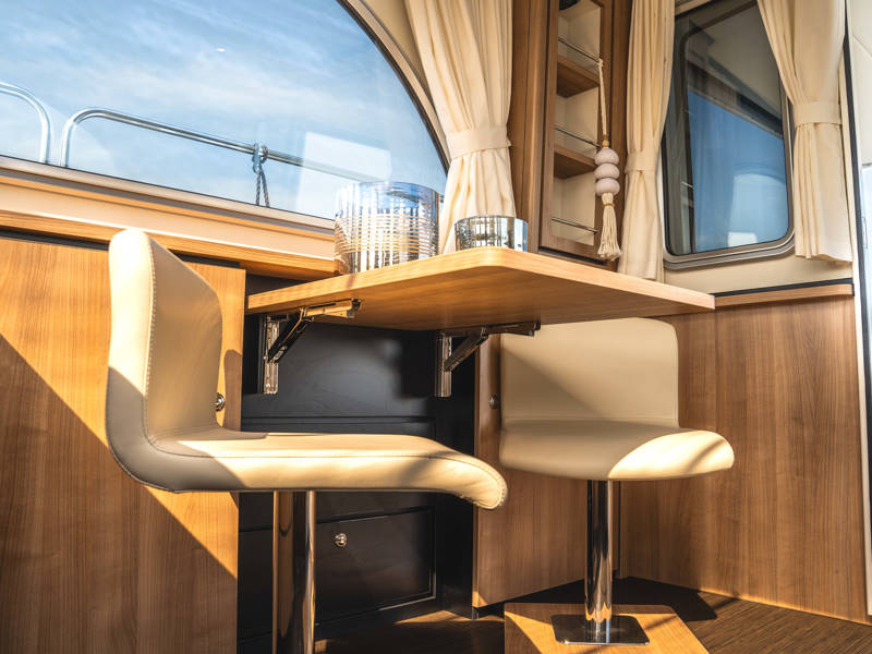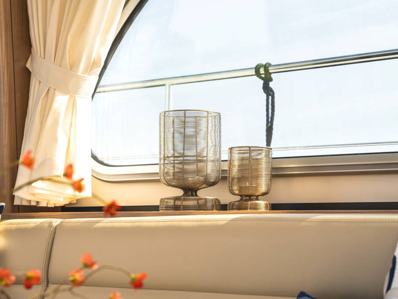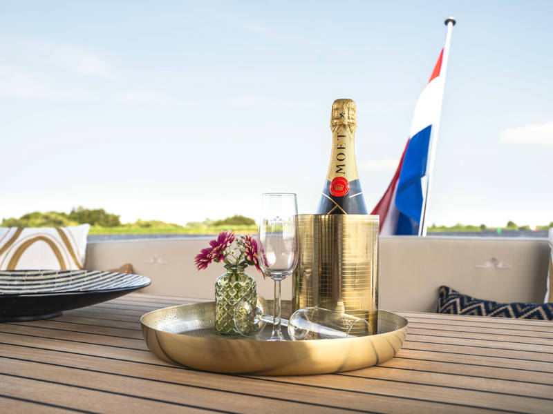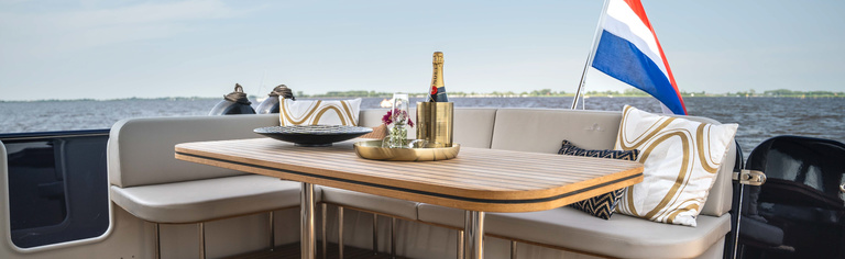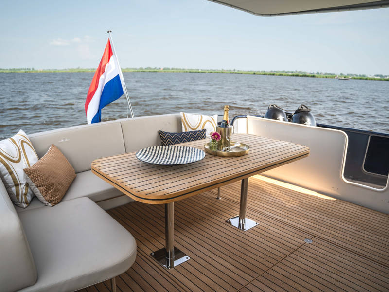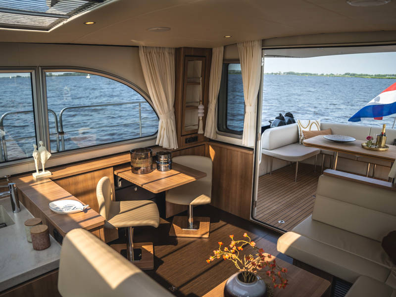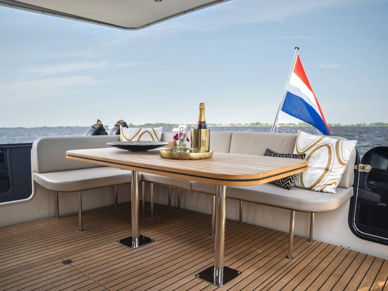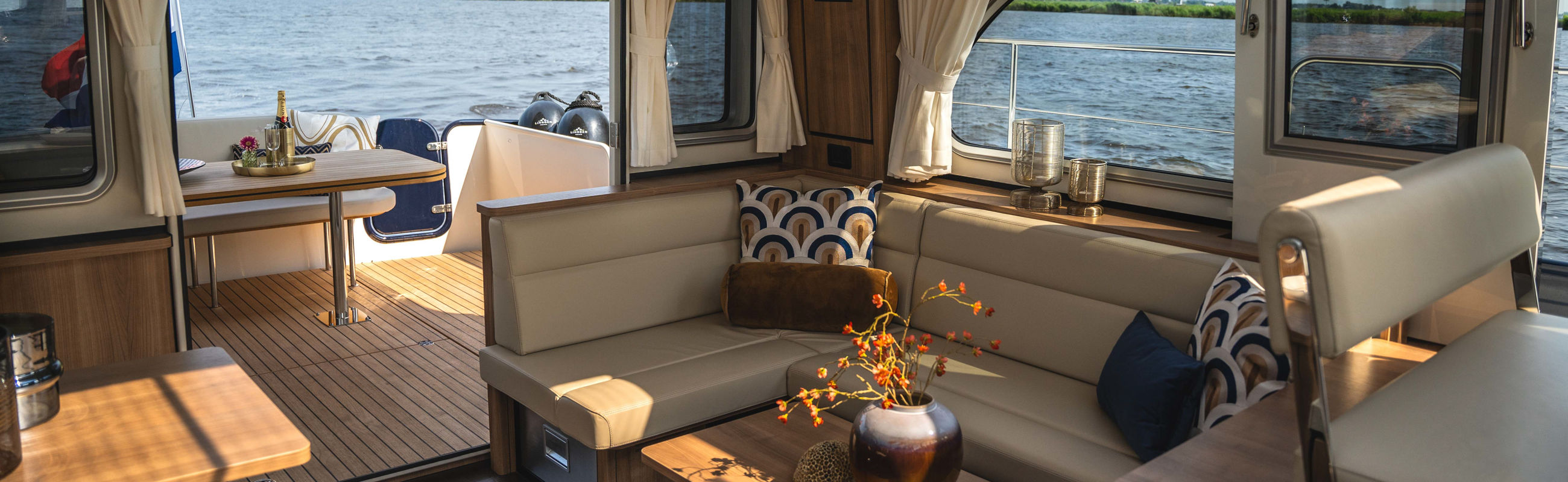 In de kuip is een fijne royale bank en een eettafel. De open kuip heeft een doorlopende long-top met sfeervolle verlichting. De kuip kan geheel worden afgesloten tot een verlenging van de salon.