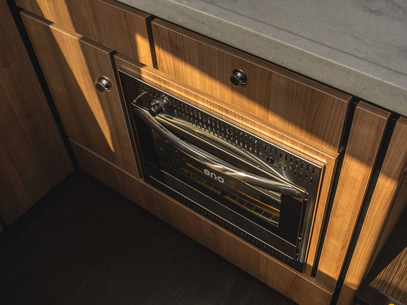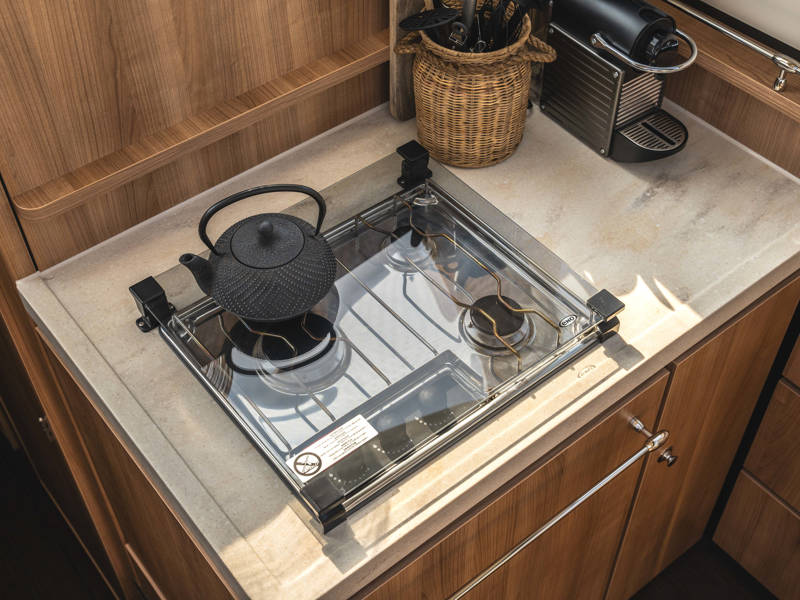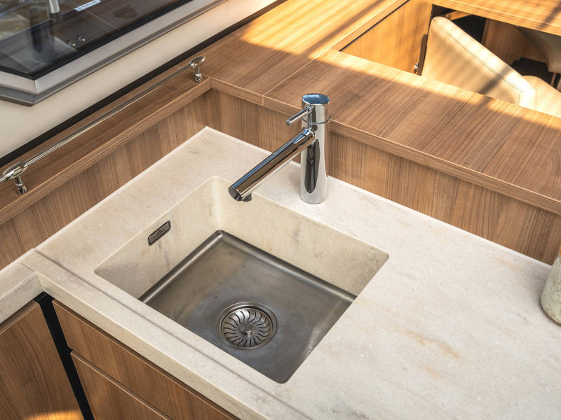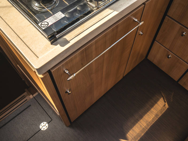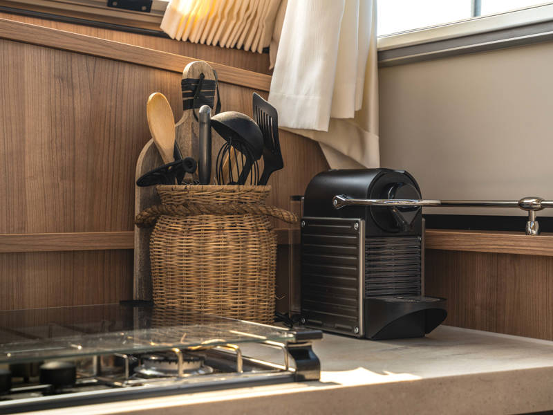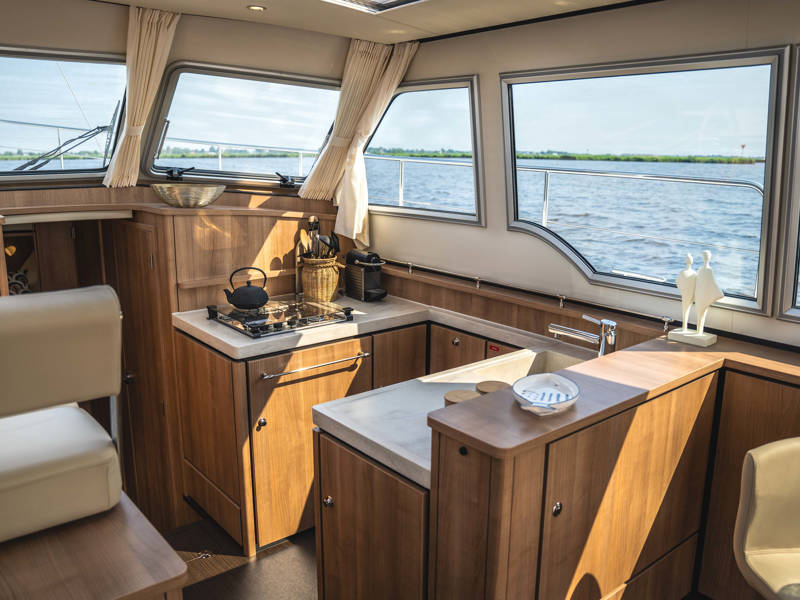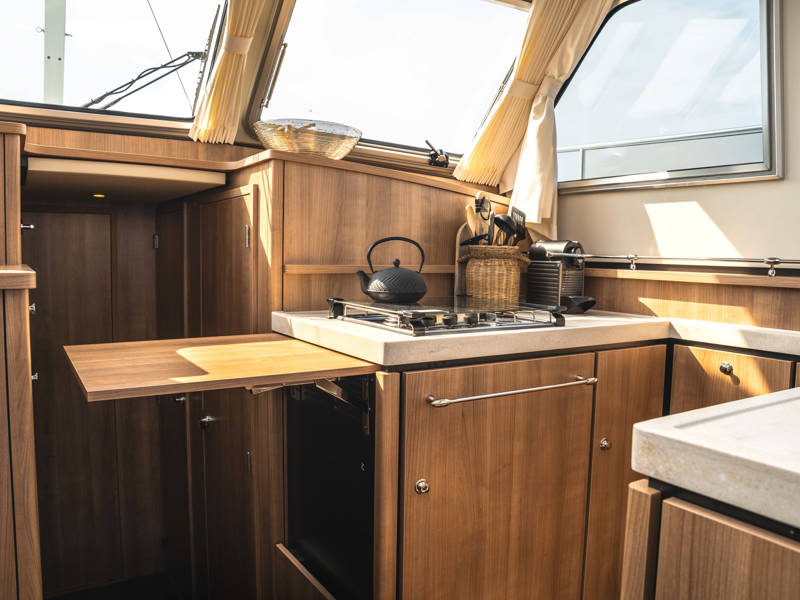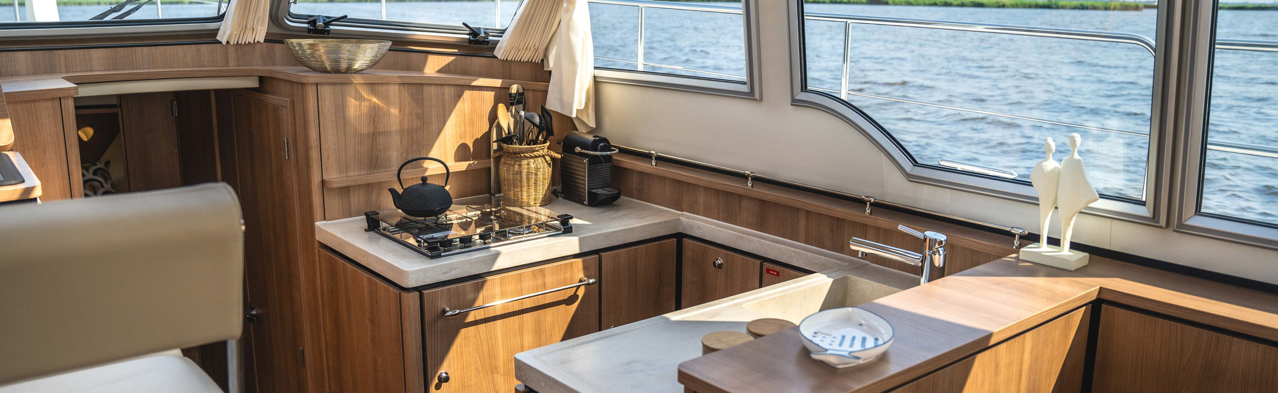 De keuken is volledig uitgerust voor een lang en prettig verblijf aan boord.