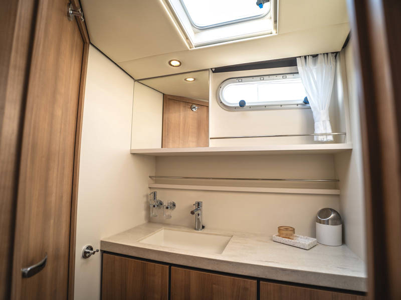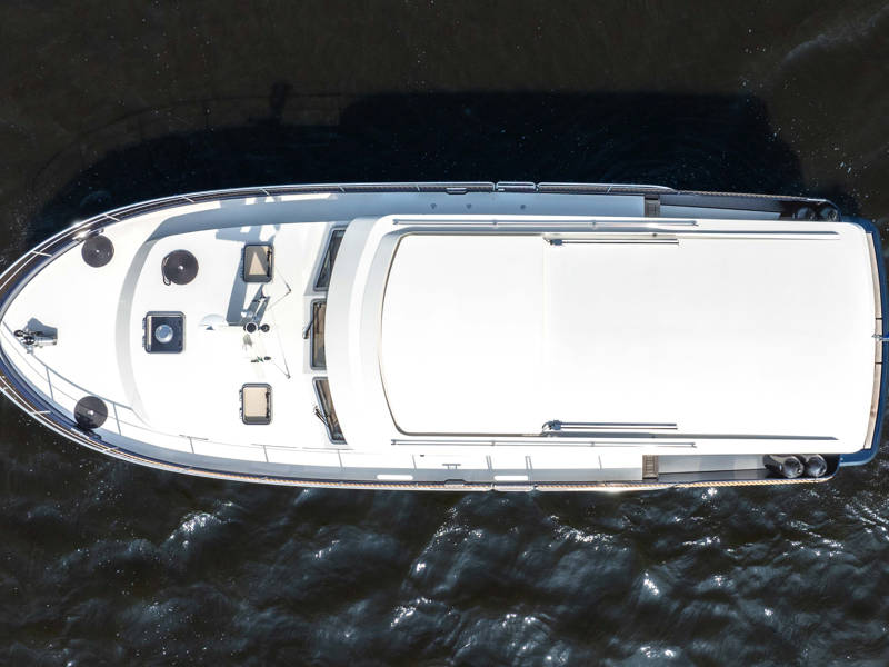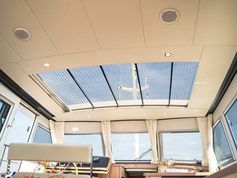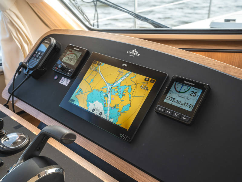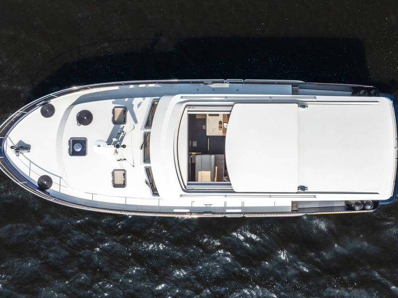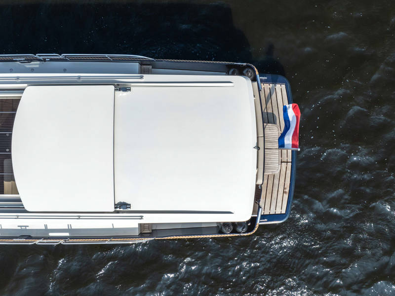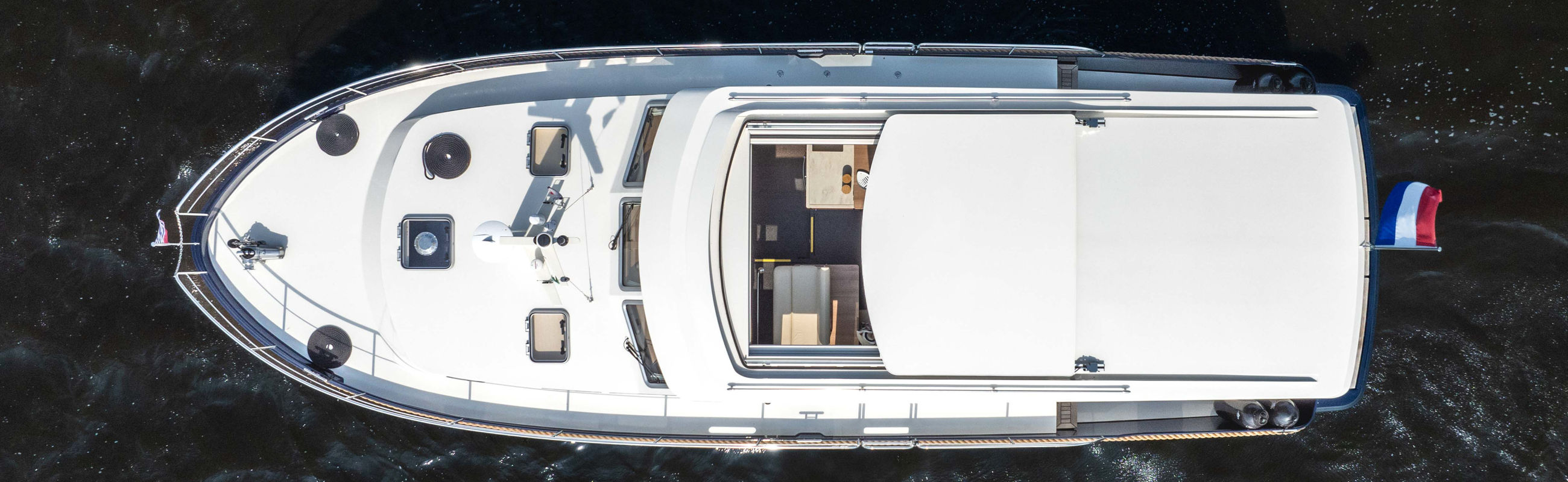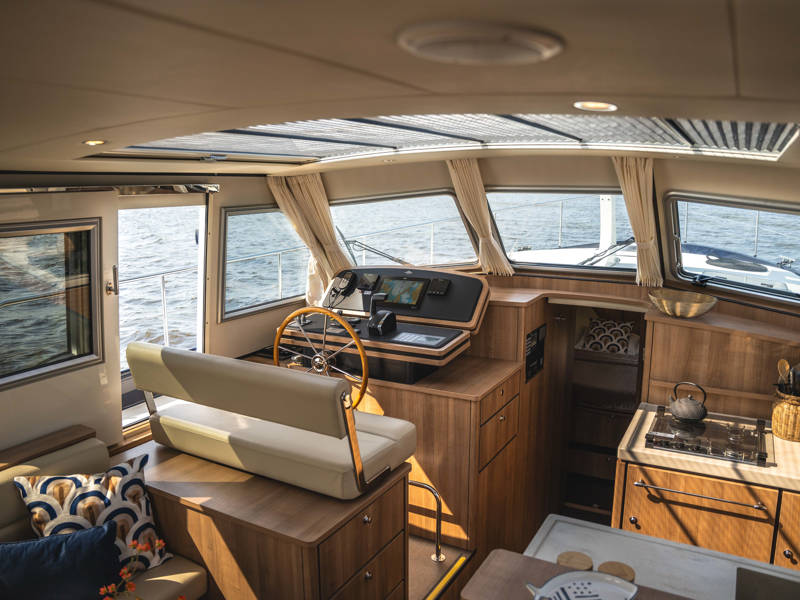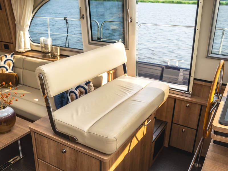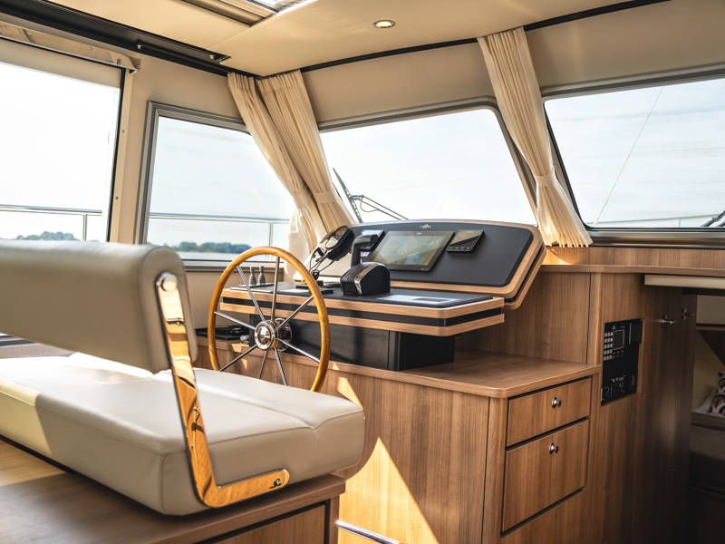 De stuurstand is uitgerust met een zeer compleet navigatiepakket, een twee-persoons stuurbank en aan BB-zijde een schuifdeur. Tevens een full-roof schuifdak, wat het vrij gevoel geeft dat je buiten zit.