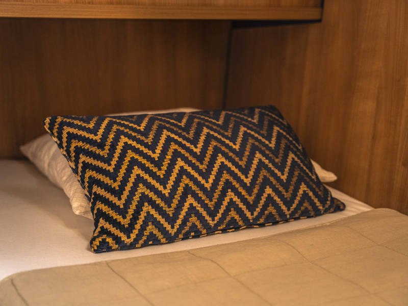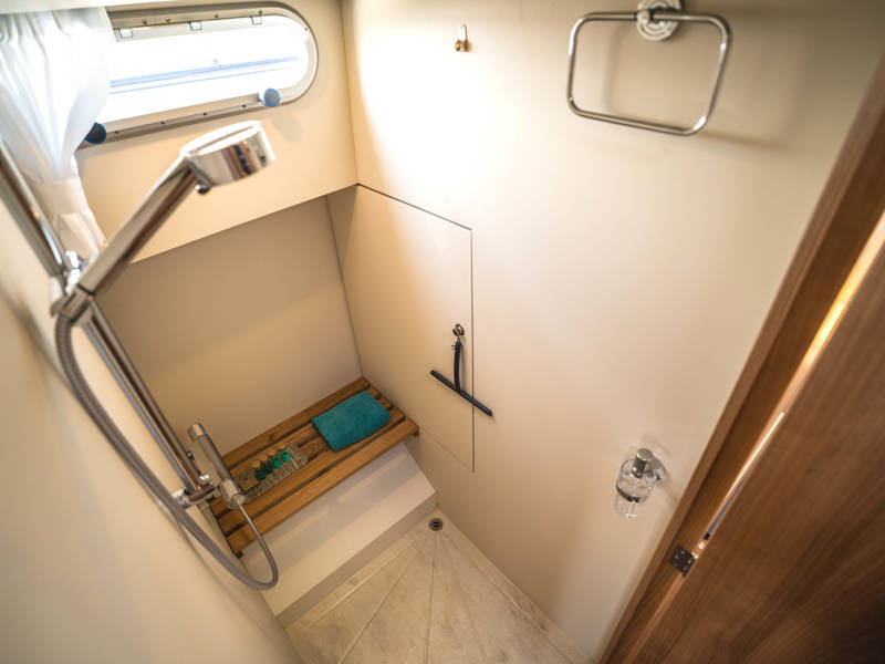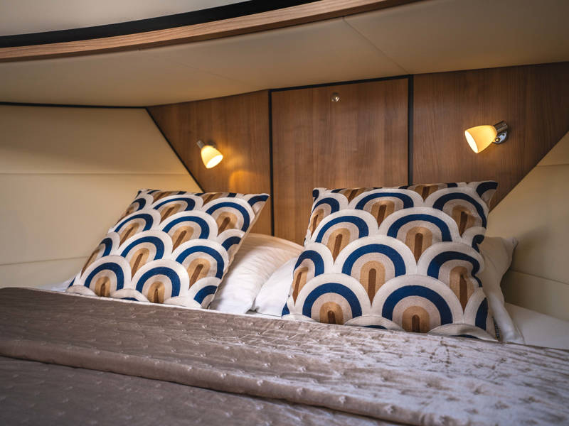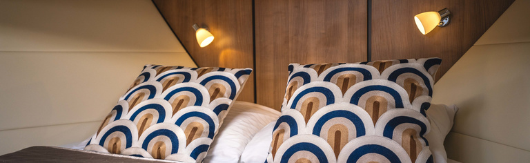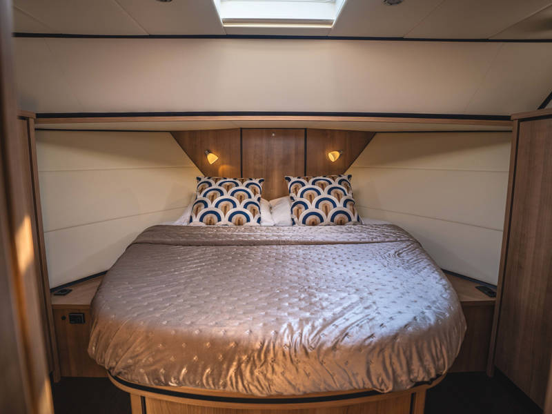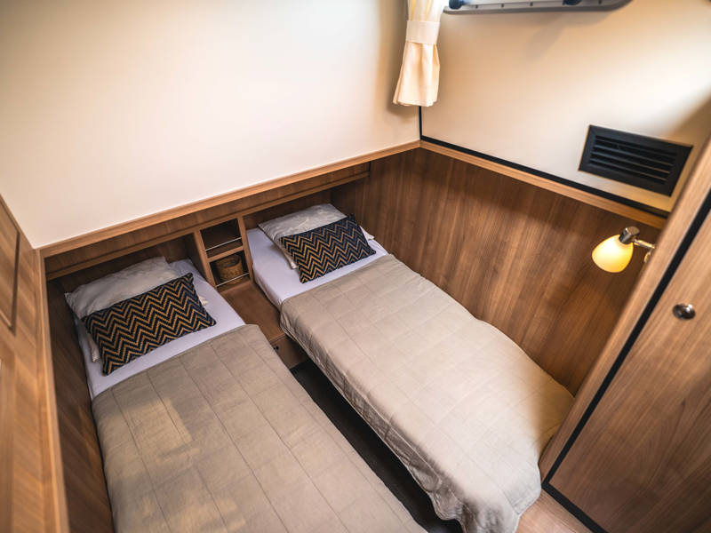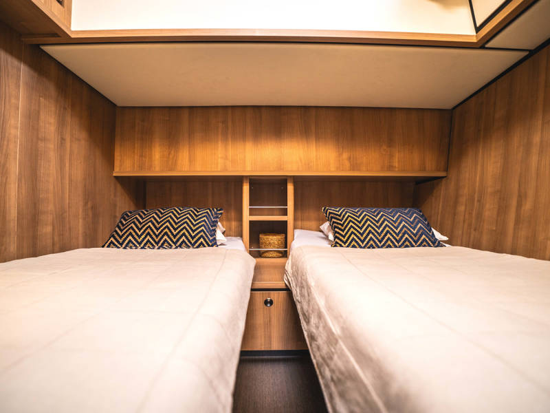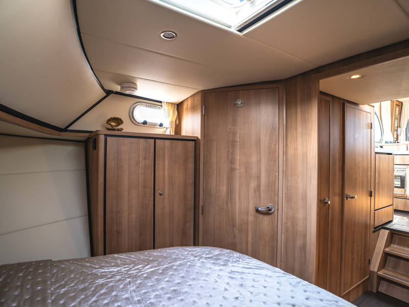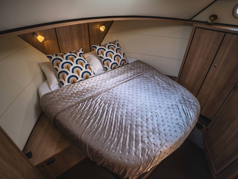 De boot is uitgerust met twee slaaphutten. Een hut heeft een vrijstaand 2-persoonsbed en de andere hut heeft 2 een-persoonsbedden. Verder is er aan een ruime badkamer en een toilet.