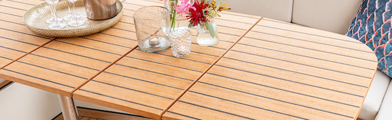 Het achterdek is uitgevoerd in echt teakhout, wat het jacht luxe nautische allure geeft.
