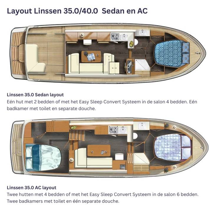- Vaarervaring: Met een Sedan-model vaart u dichter bij het water, terwijl een AC-model een verhoogd achterdek biedt met beter overzicht.