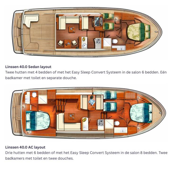 Een Linssen Grand Sturdy 40.0 AC of 40.0 Sedan is een betere keuze. Dit jacht biedt drie hutten met zes bedden. Indien nodig kan de salonbank ook hier worden omgebouwd tot een tweepersoonsbed, wat het totaal op 8 slaapplaatsen brengt.